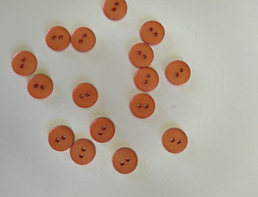 Botões laranja redondos com dois furos em superfície branca