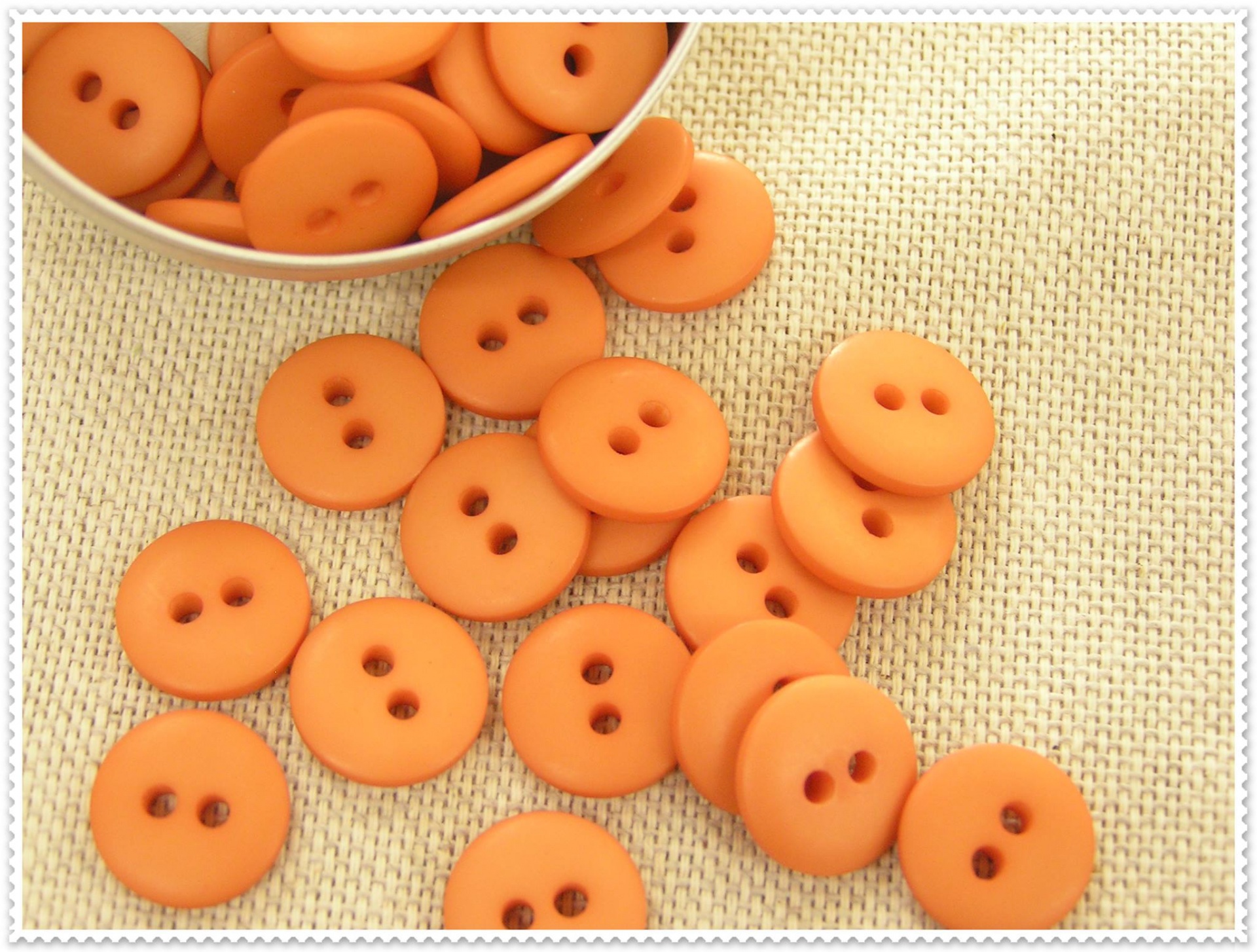 Botões laranja redondos com dois furos sobre superfície bege
