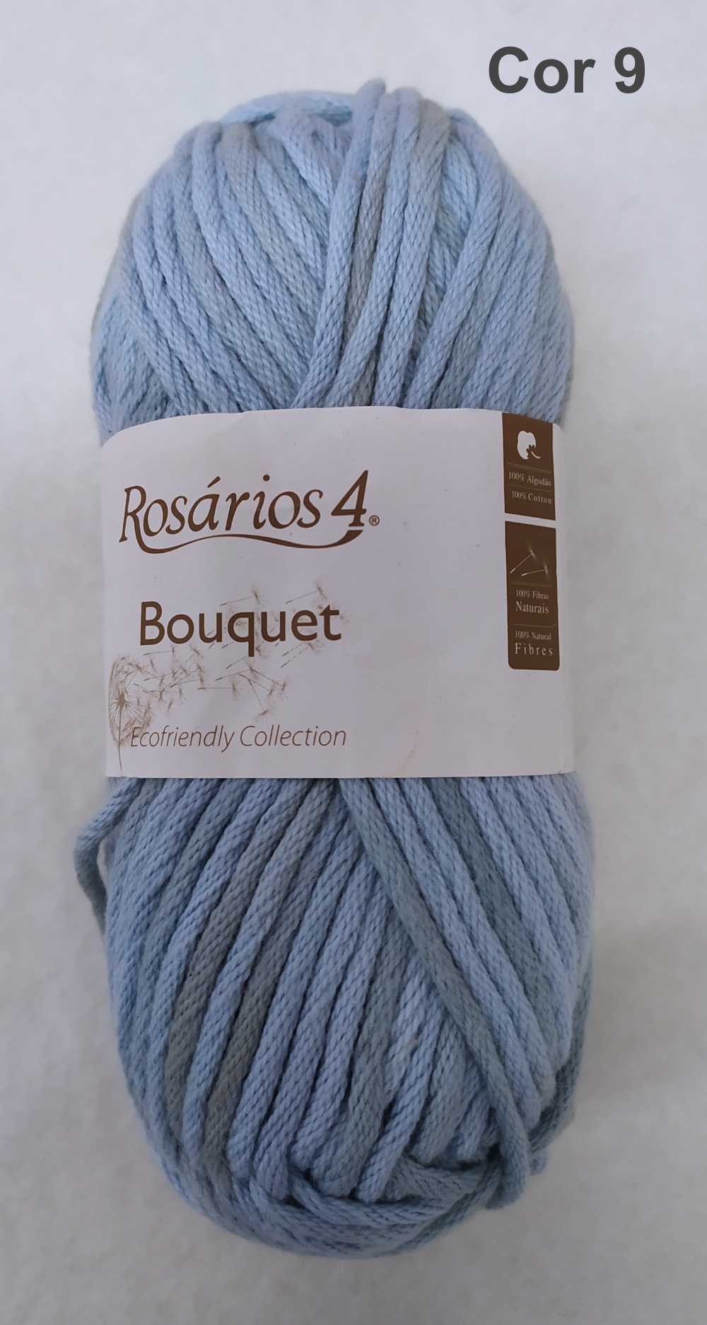 Novelo de fio azul claro com etiqueta Rosários 4 Bouquet Cor 9