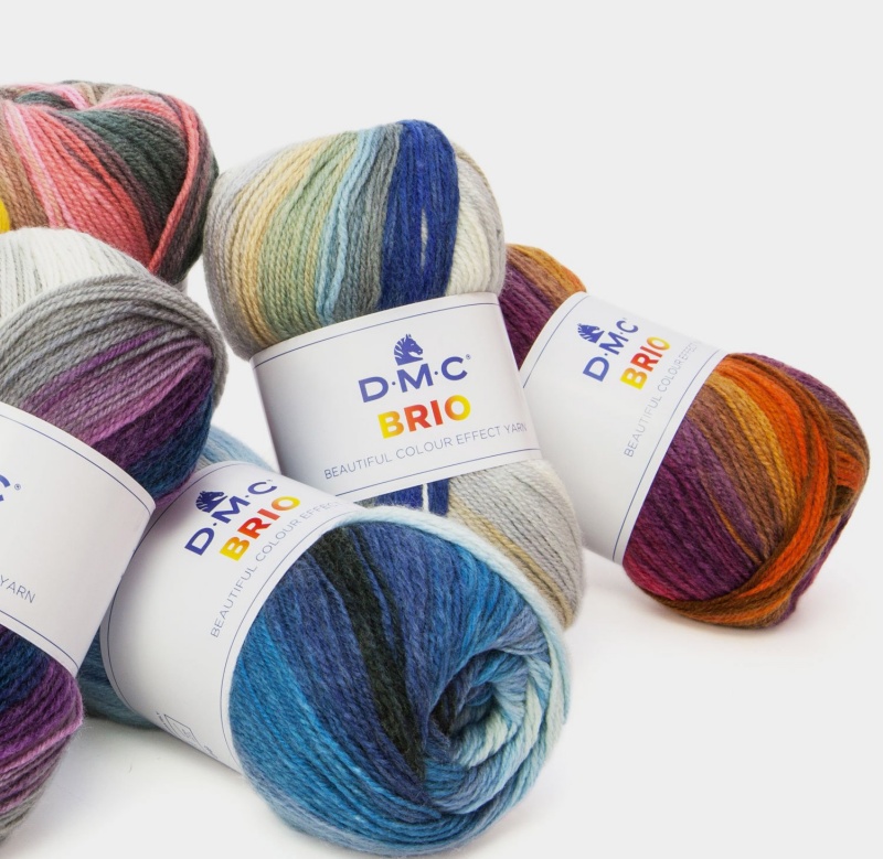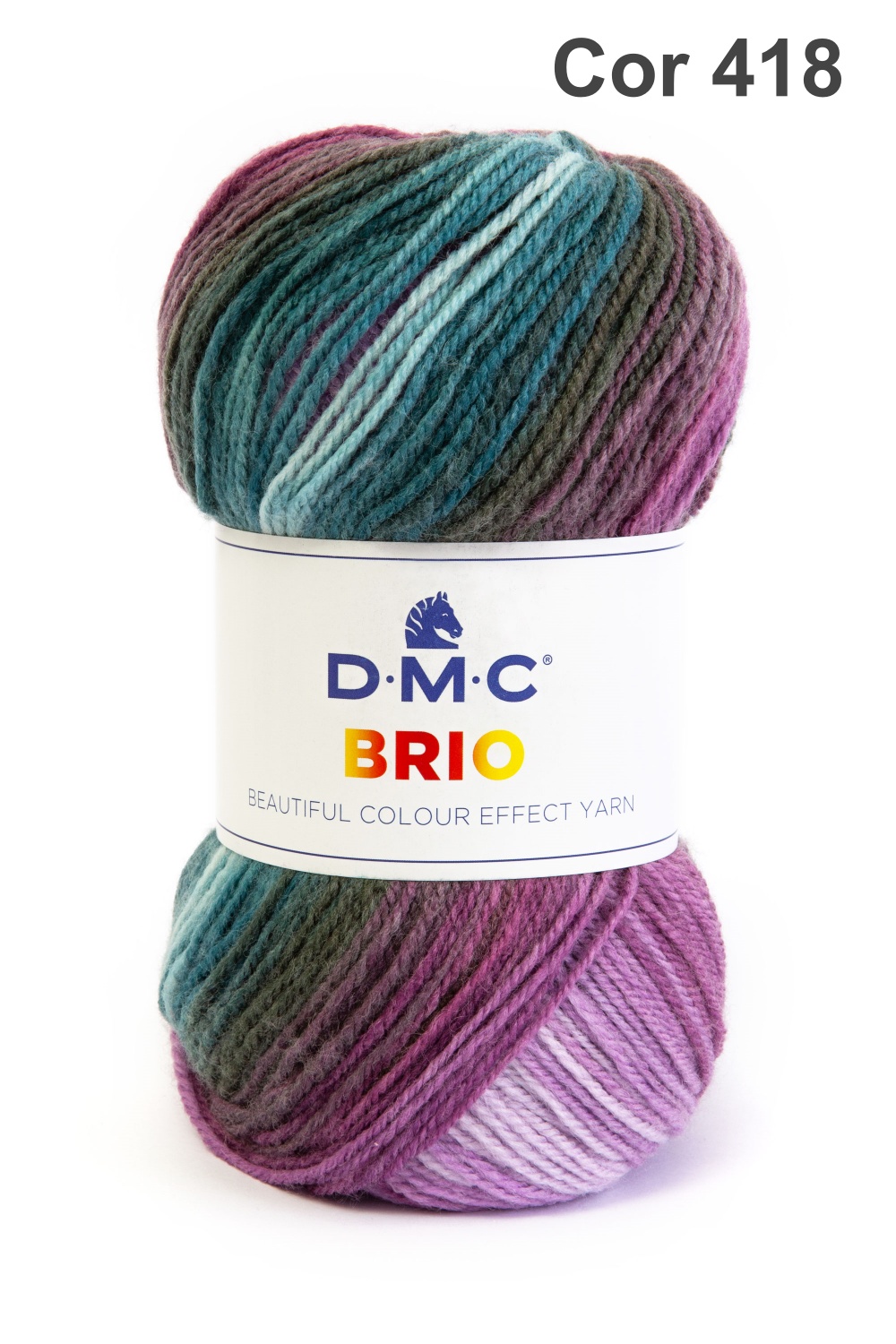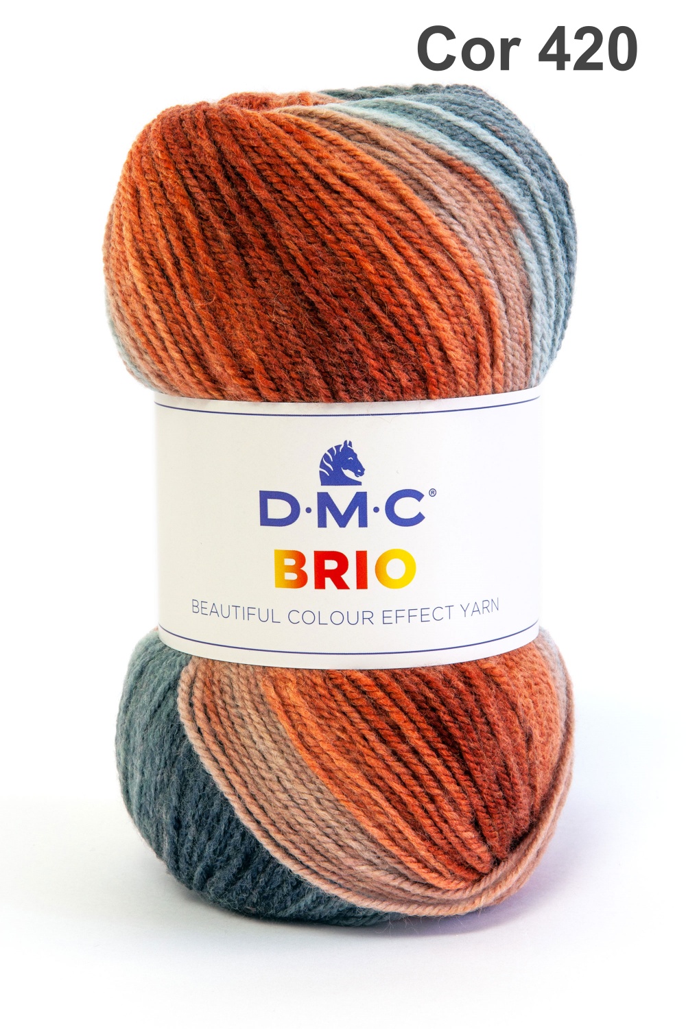 Novelo de lã multicolorido D.M.C BRIO com etiqueta branca e texto Cor 420