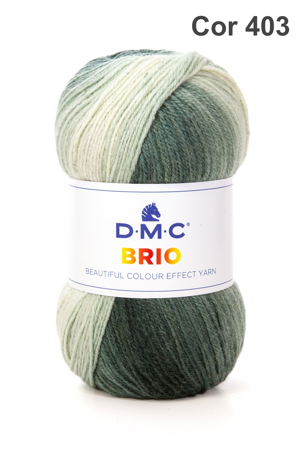 Novelo de lã D.M.C BRIO com rótulo branco e mistura de cores verde e bege.