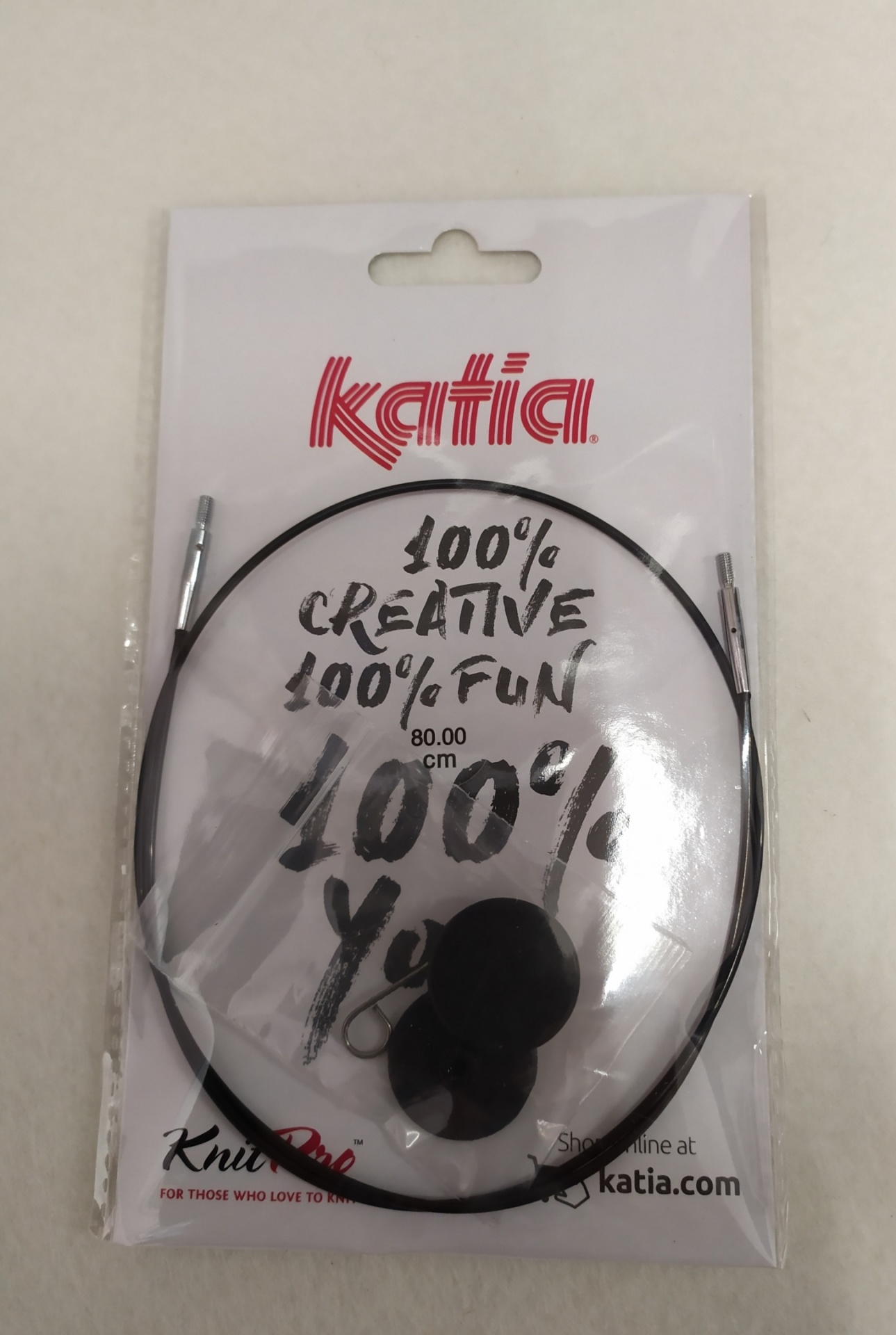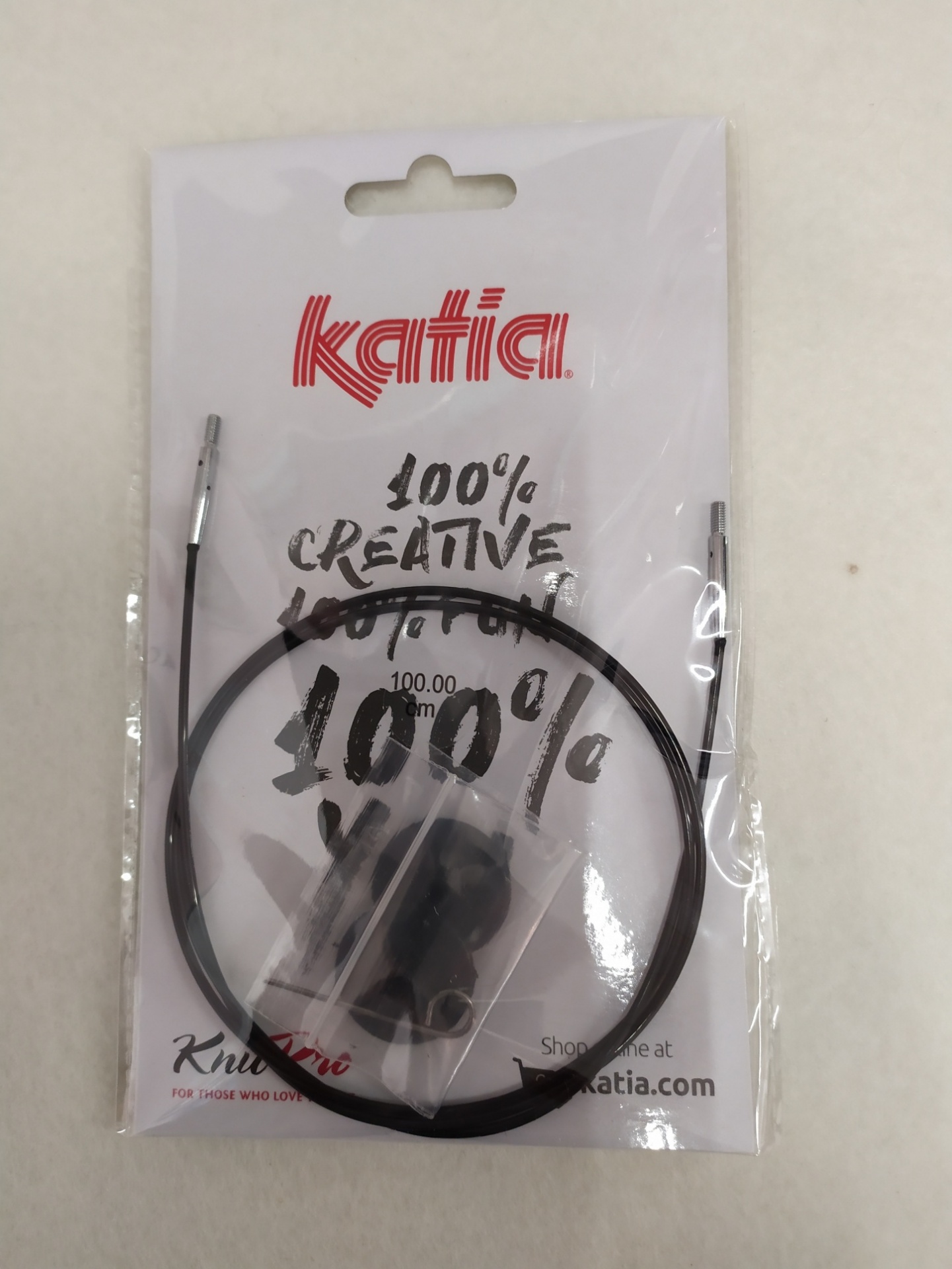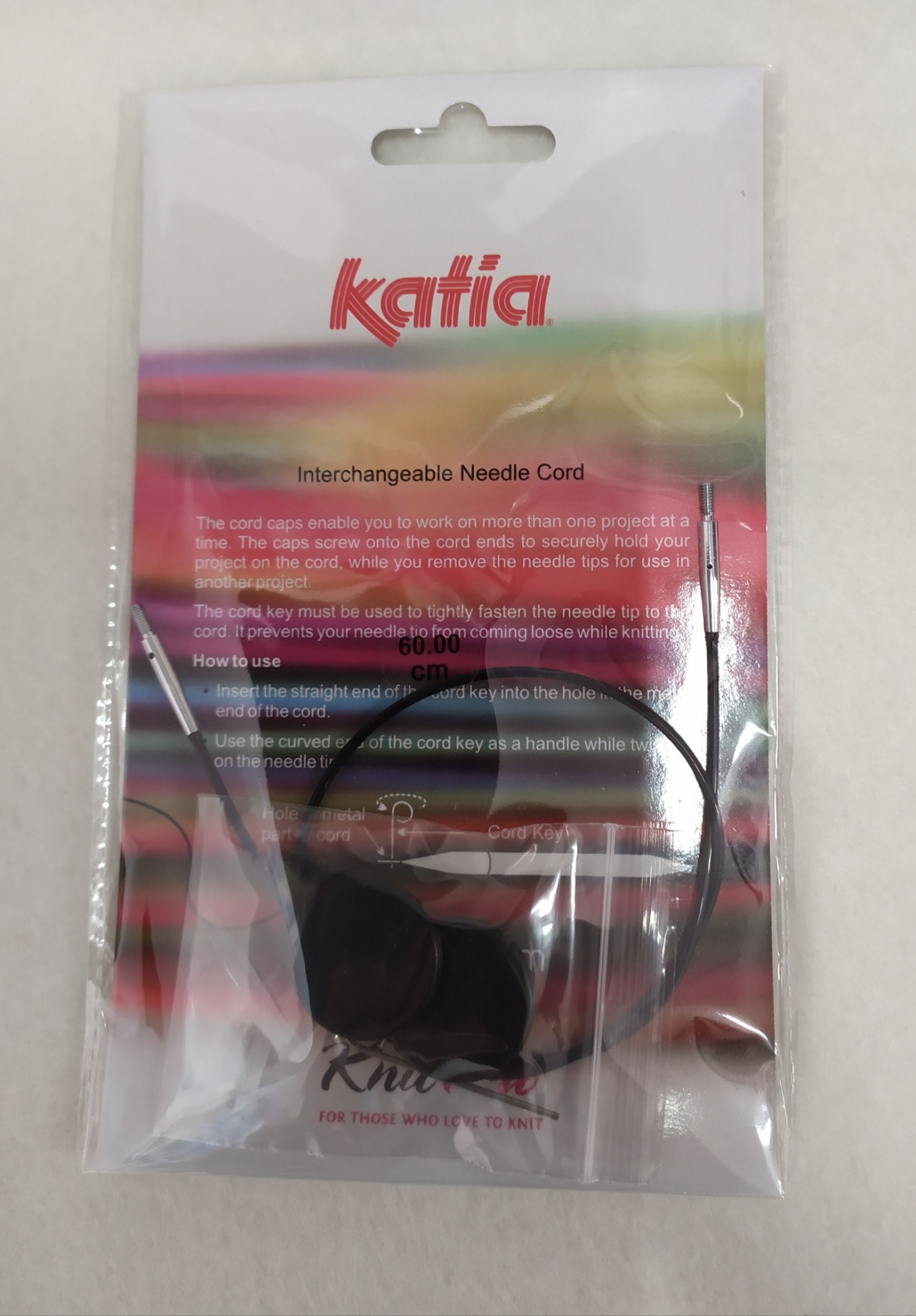 Cordão intercambiável para agulhas Katia em embalagem plástica transparente com fundo colorido e texto
