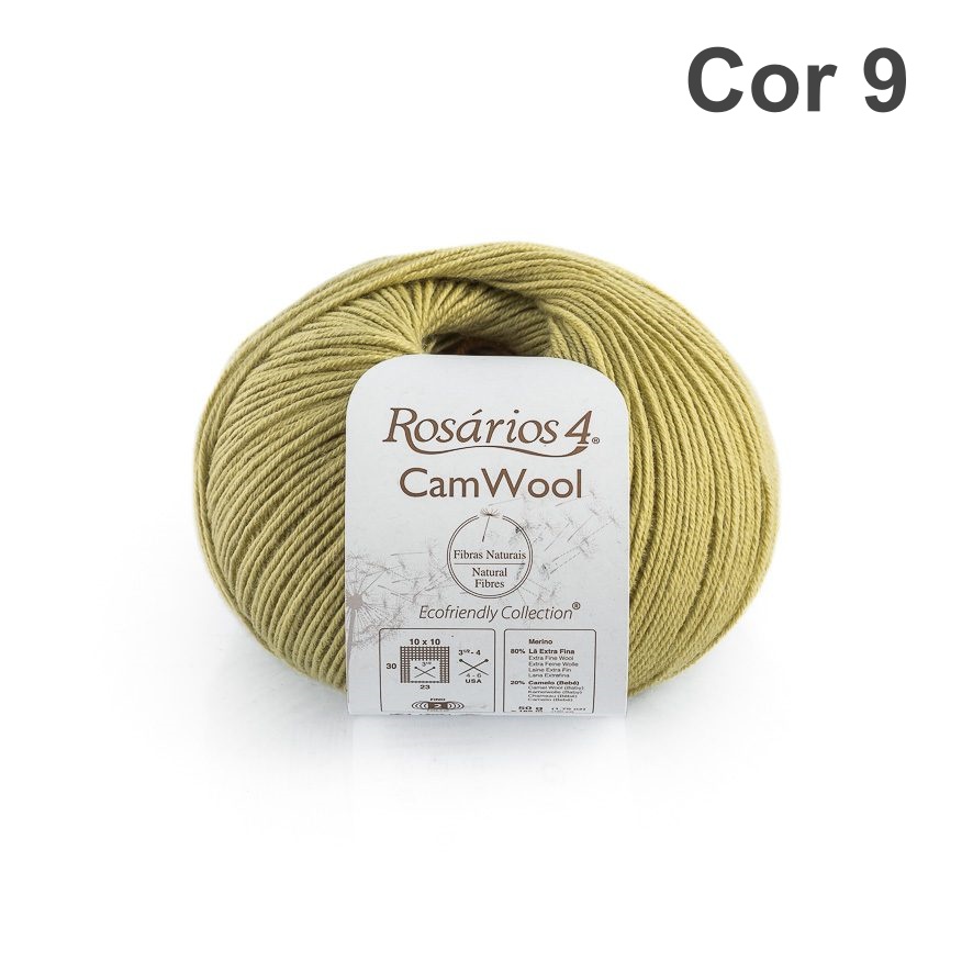 Novelo de lã verde-oliva Rosários 4 CamWool cor 9 com etiqueta branca