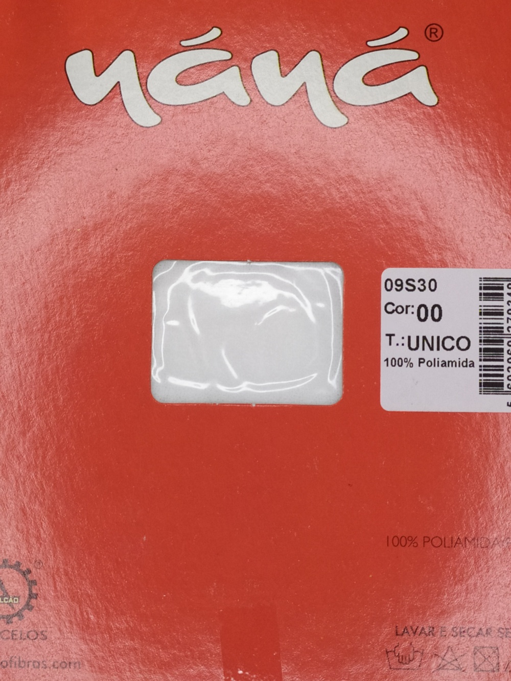 Embalagem vermelha com amostra de tecido branco e etiquetas de produto NANÁ