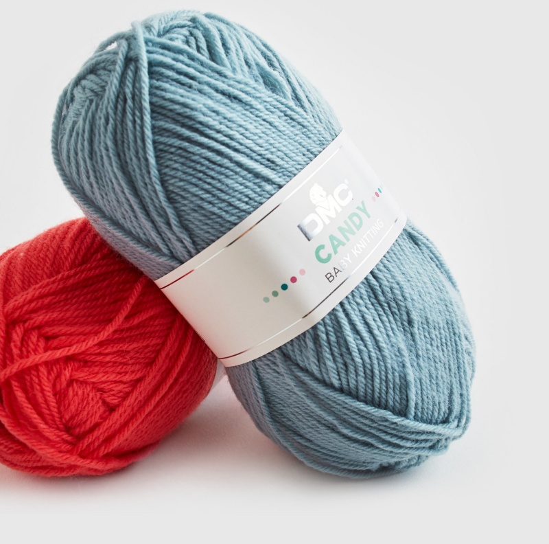Novelos de lã azul claro e vermelho, novelo azul com rótulo branco escrito DMC CANDY