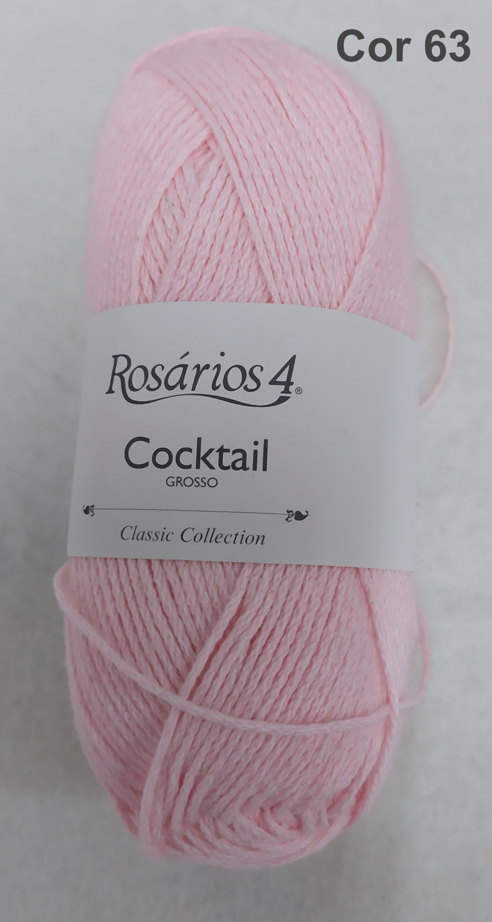 Novelo de lã rosa claro com etiqueta Rosários 4 Cocktail Grosso