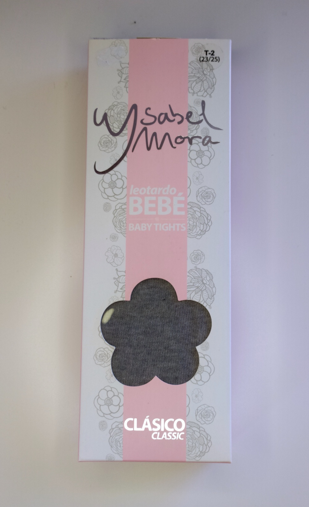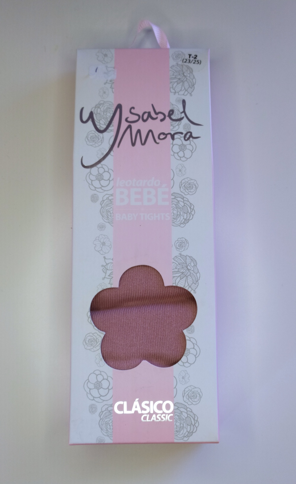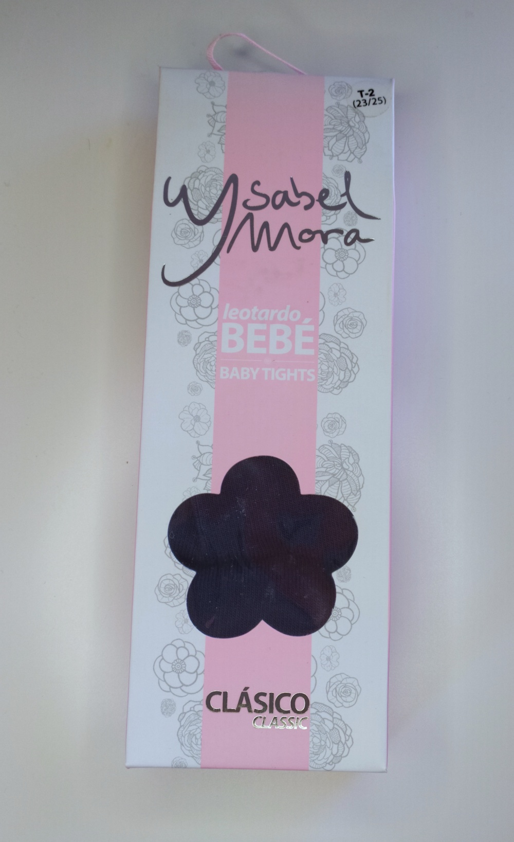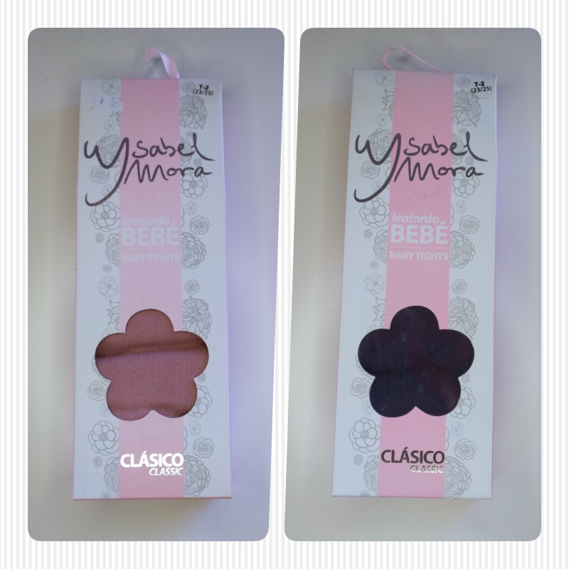 Embala de collants para bebé com marca Ysabel Mora em cores branco e rosa