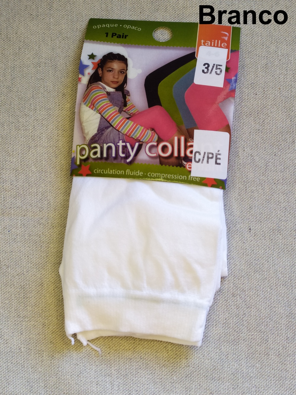 Meia-calça branca infantil em embalagem com imagem de menina e texto em português e francês