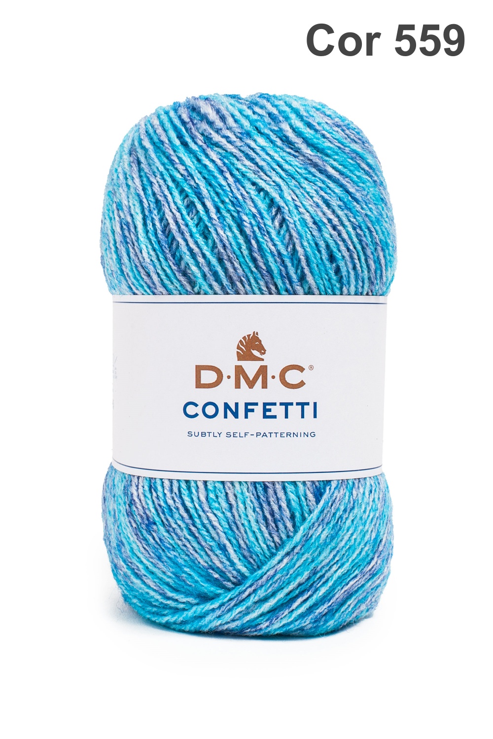 Novelo de lã azul com etiqueta branca da marca D.M.C CONFETTI cor 559