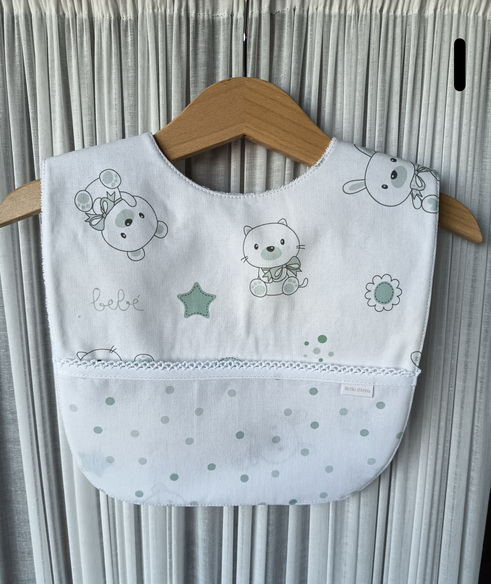 Babete branco com desenhos infantis e padrão de bolinhas verdes pendurado em cabide de madeira