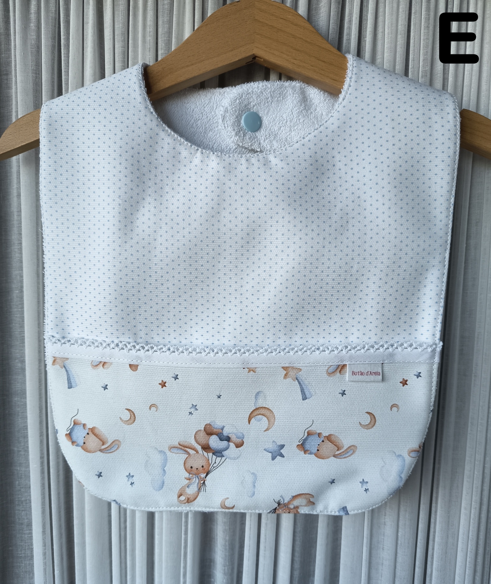 Babete branco com pequenos pontos azuis, estampado com coelhinhos, luas e estrelas, pendurado em cabide de madeira.