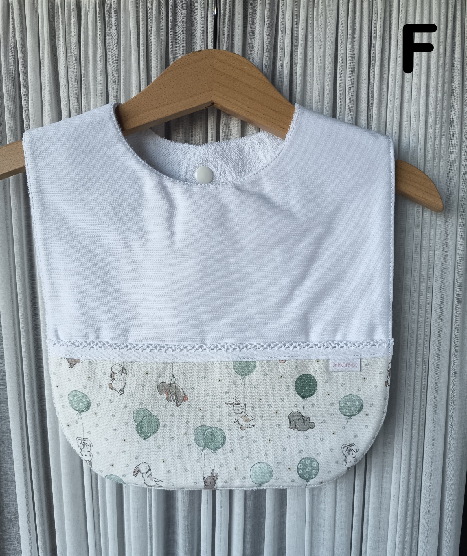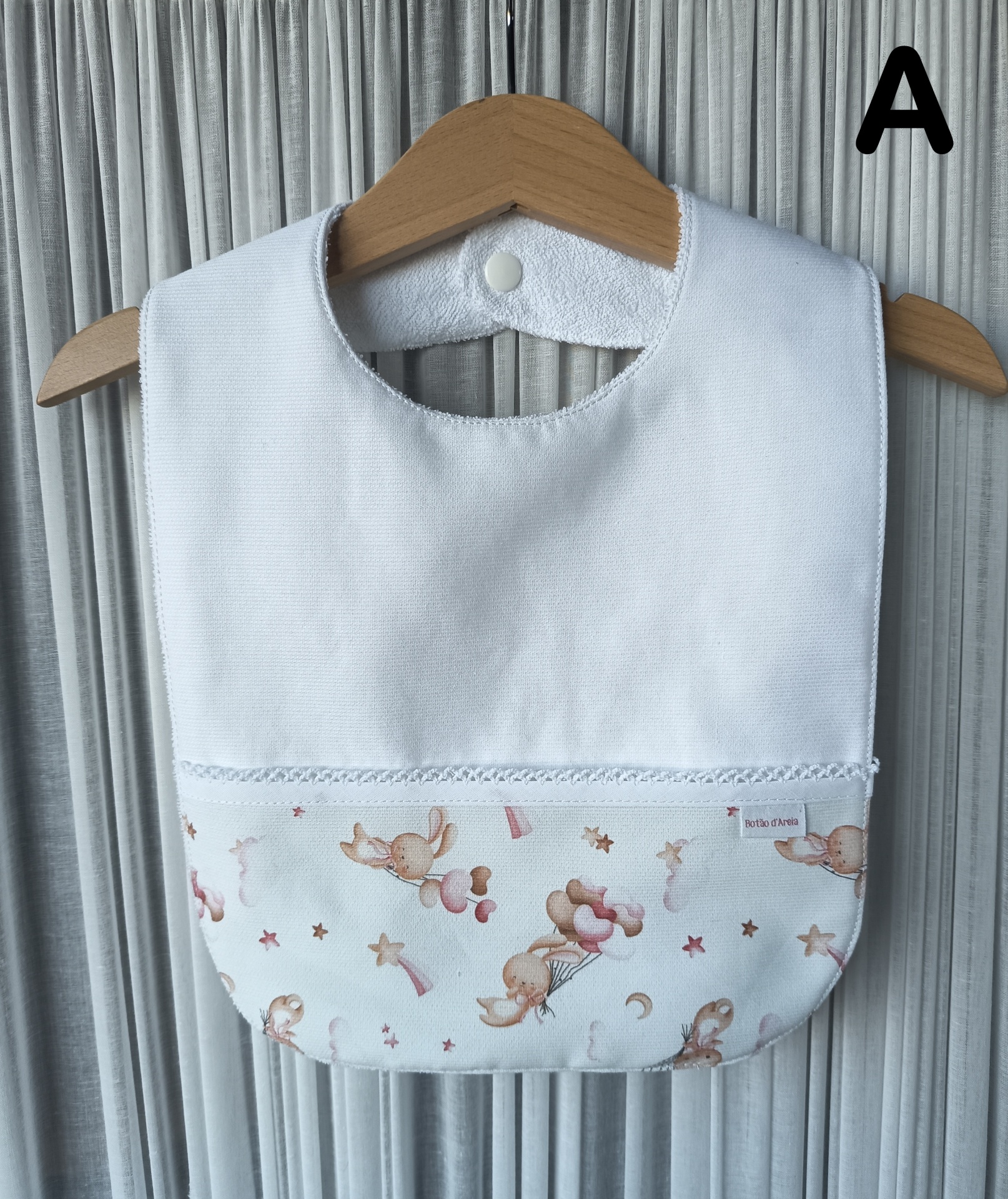 Babete branco e padrão com coelhinhos e balões, pendurado em cabide de madeira