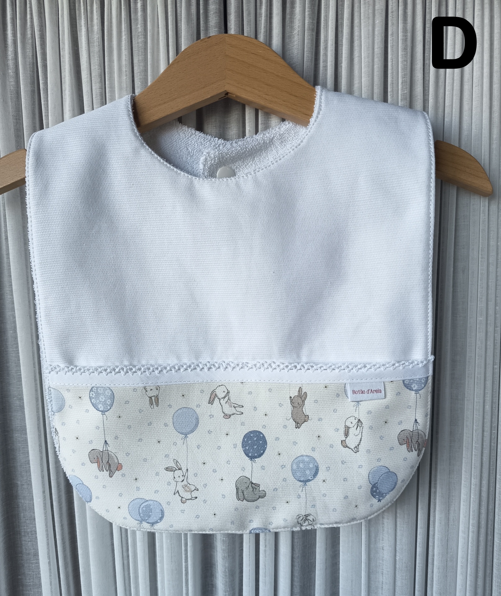 Babete branco de bebé com padrão de coelhos e balões azul em cabide de madeira