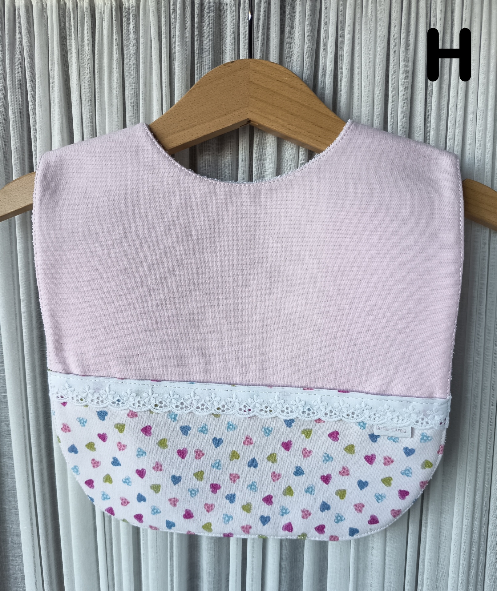 Babete de bebé cor-de-rosa e branco com corações coloridos e renda pendurado num cabide de madeira