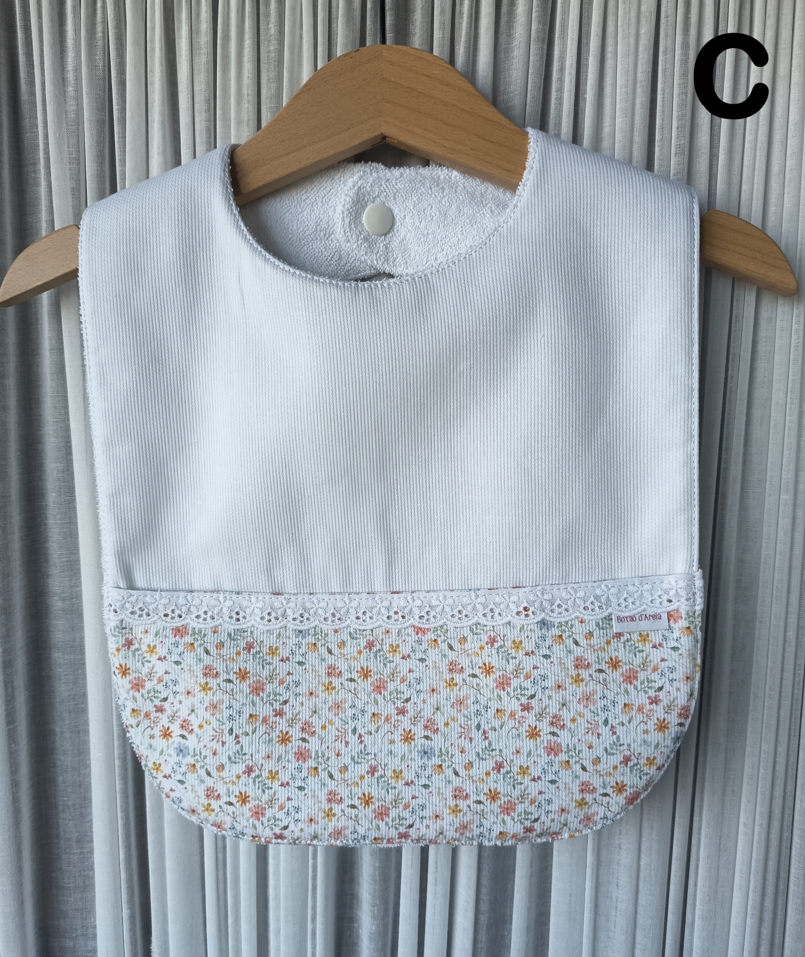 Babete para bebé branco com parte inferior floral e renda pendurado em cabide de madeira