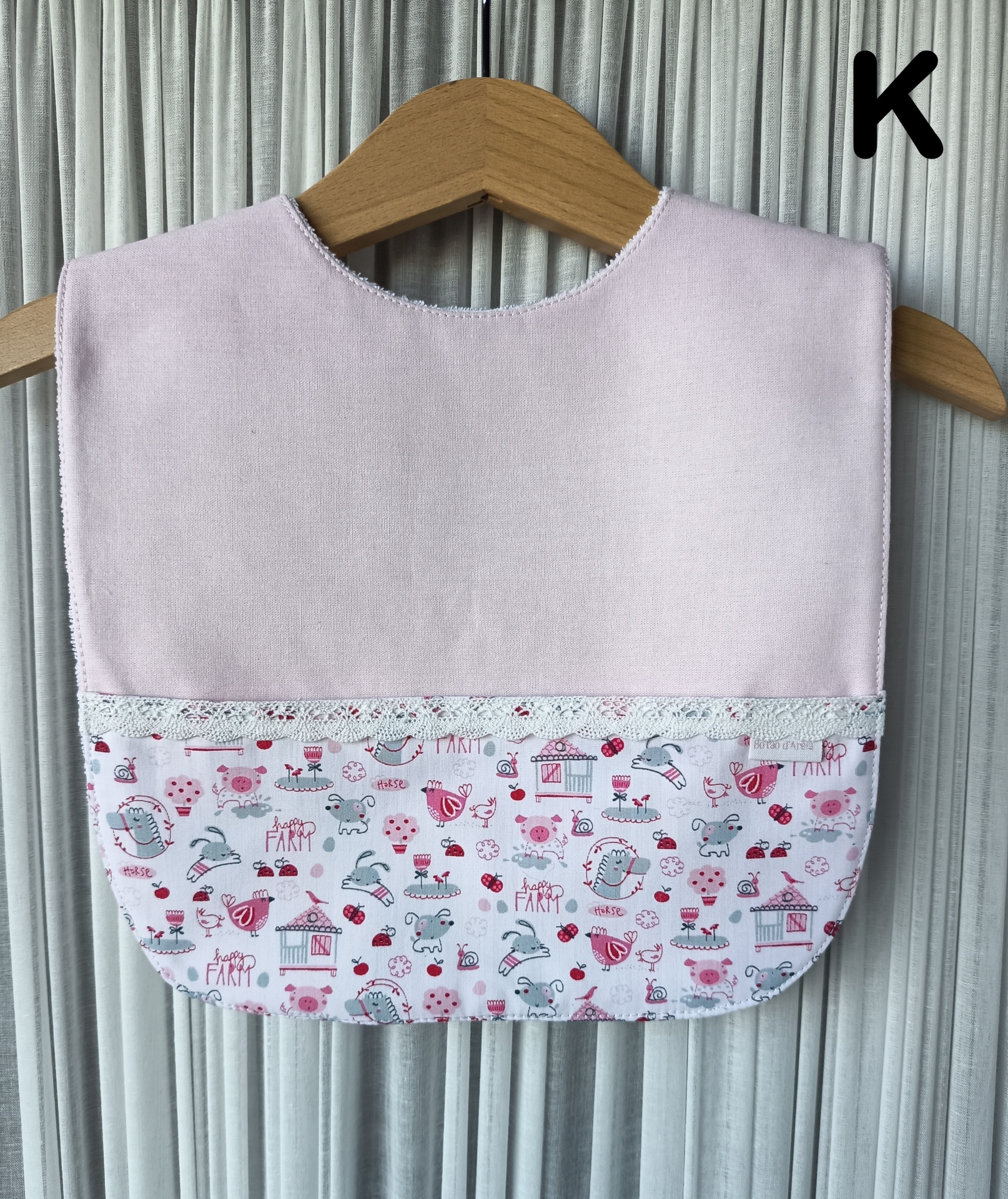 Babete para bebé rosa com estampa de animais da quinta e renda branca