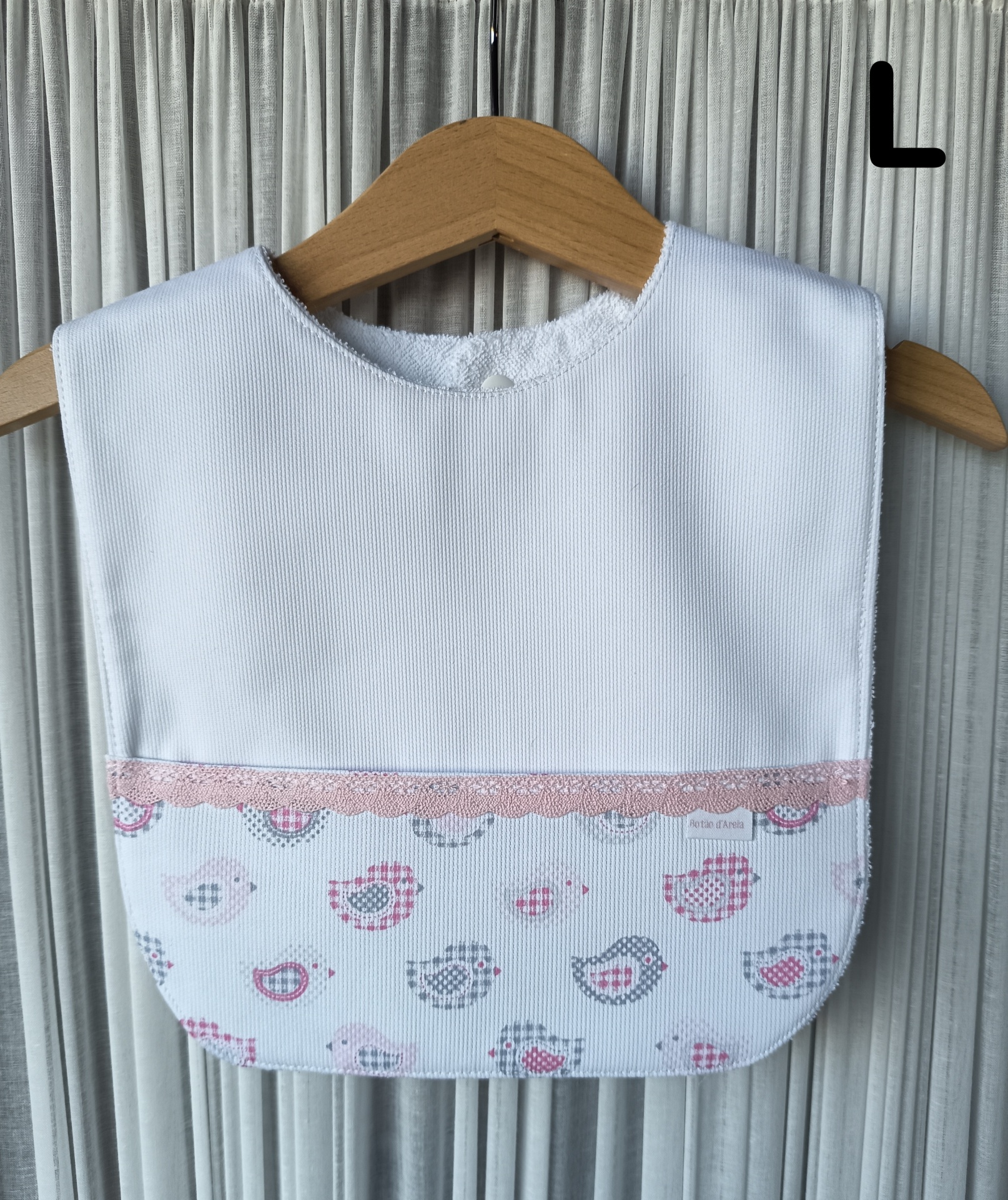 Babete de bebé branco com estampado de pássaros e renda rosa pendurado em cabide de madeira.