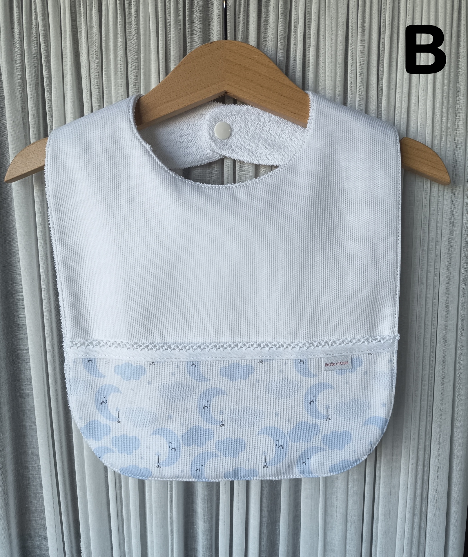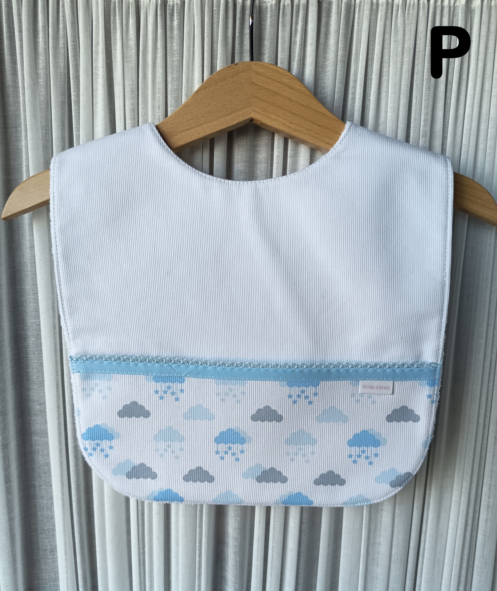 Babete de bebé branco com padrão de nuvens azuis e cinzentas, pendurado num cabide