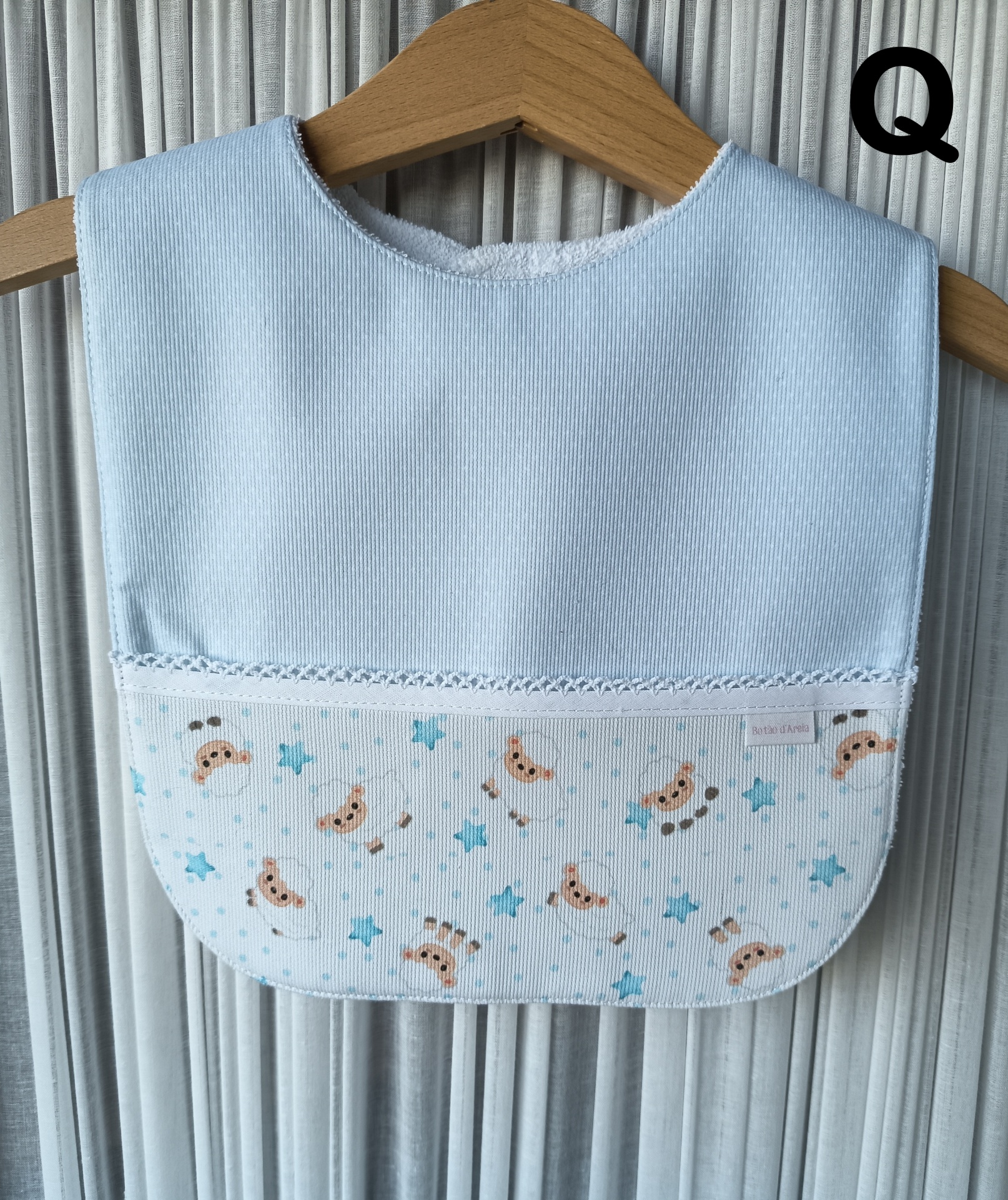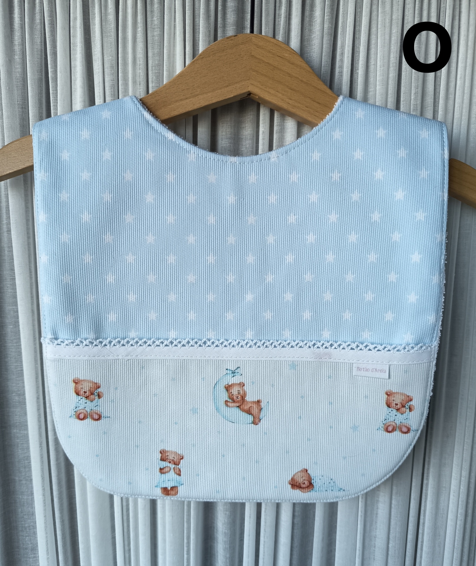 Babete azul claro com padrão de ursos e estrelas pendurado numa cabide de madeira