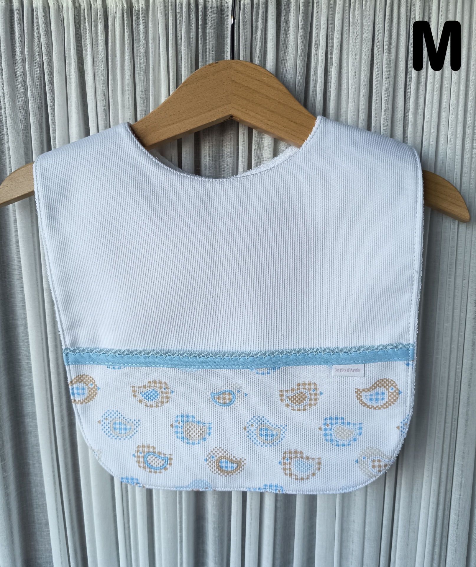 Babete branco com padrão de aves azuis e castanhas pendurado em cabide de madeira