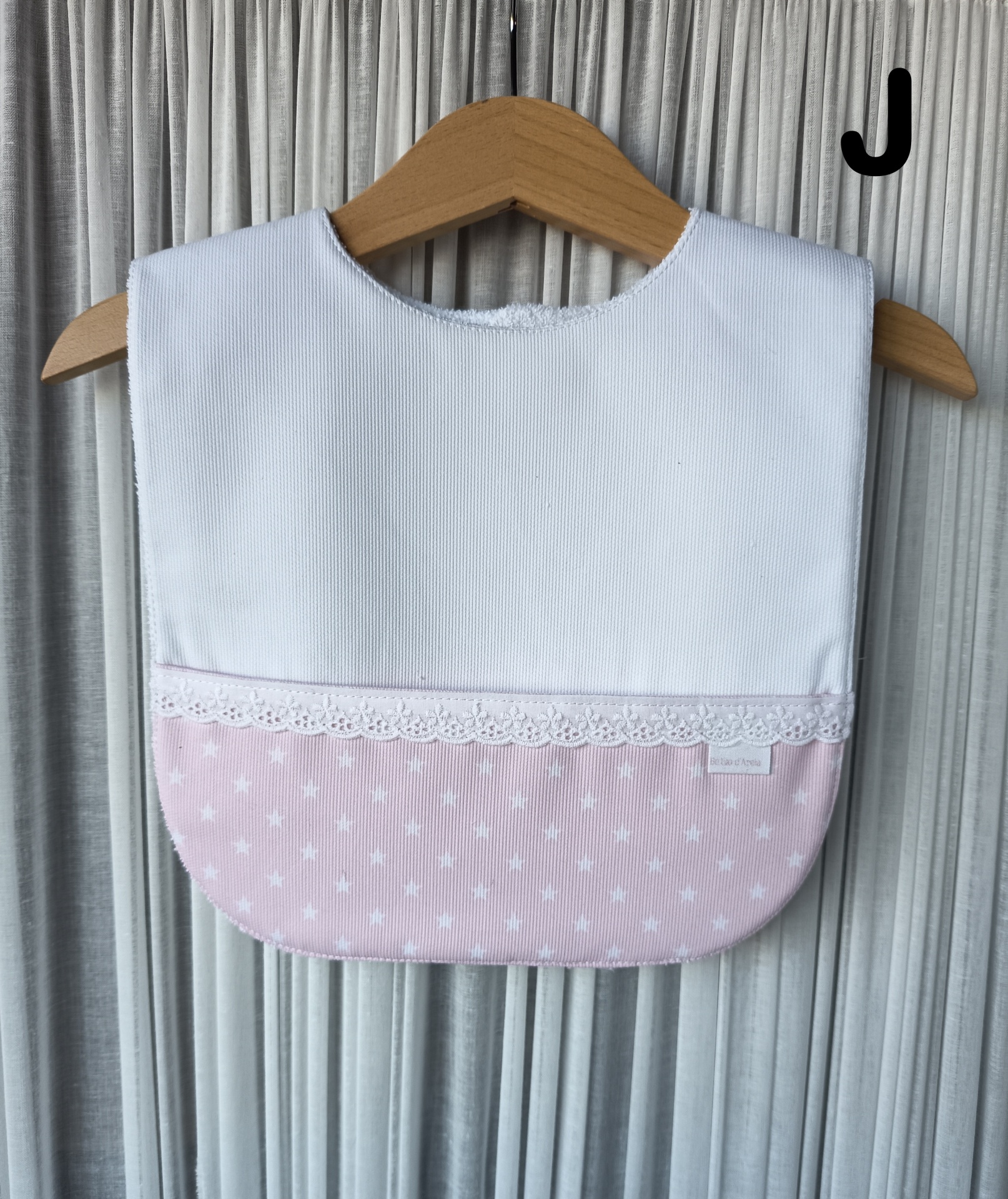 Babete para bebé branco e rosa com renda e estrelas pendurado em cabide de madeira