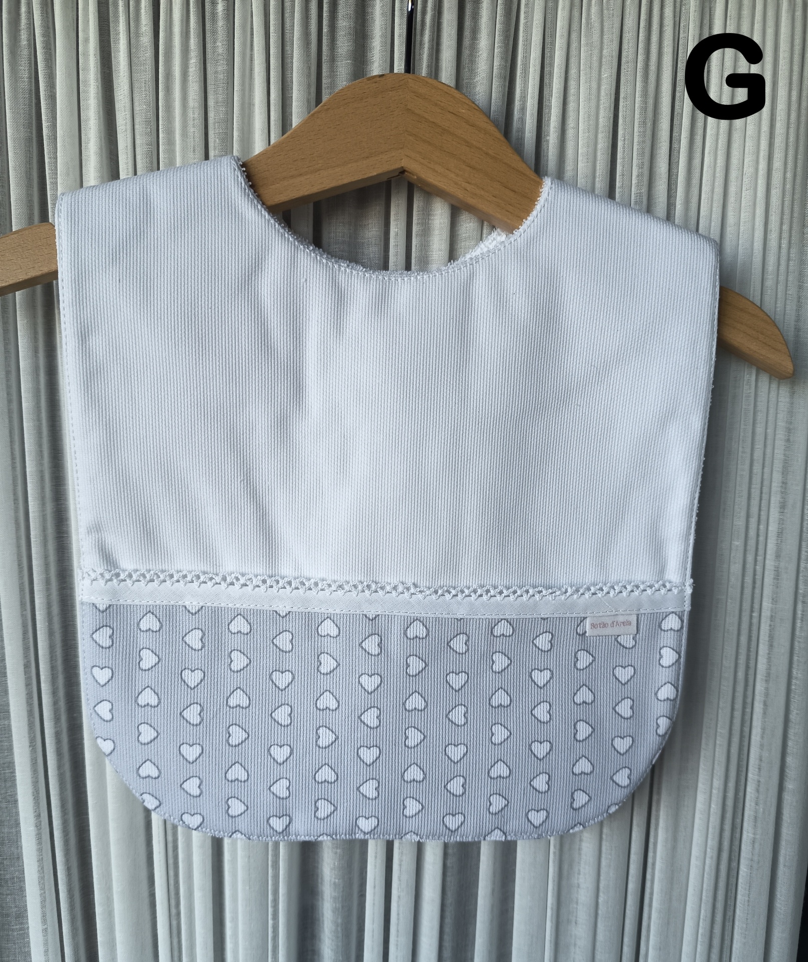 Babete de bebé branco e cinzento com padrão de corações pendurado num cabide de madeira.