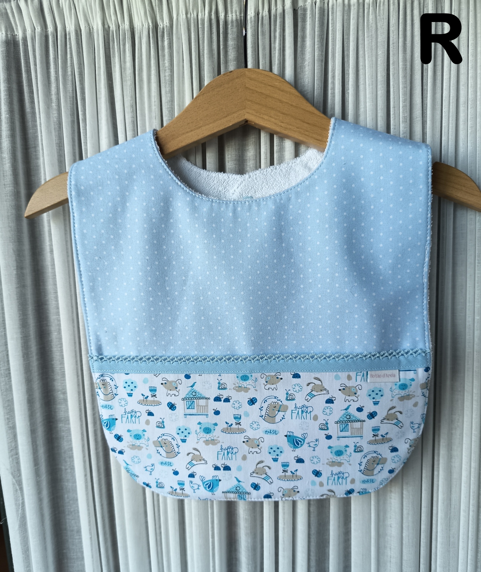 Babete azul claro com padrão de bolinhas brancas e estampado de animais de quinta em cabide
