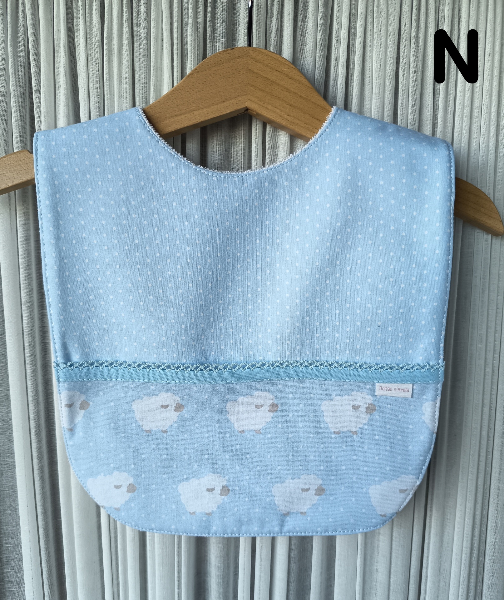 Babete azul claro com bolinhas e ovelhas brancas pendurado num cabide de madeira