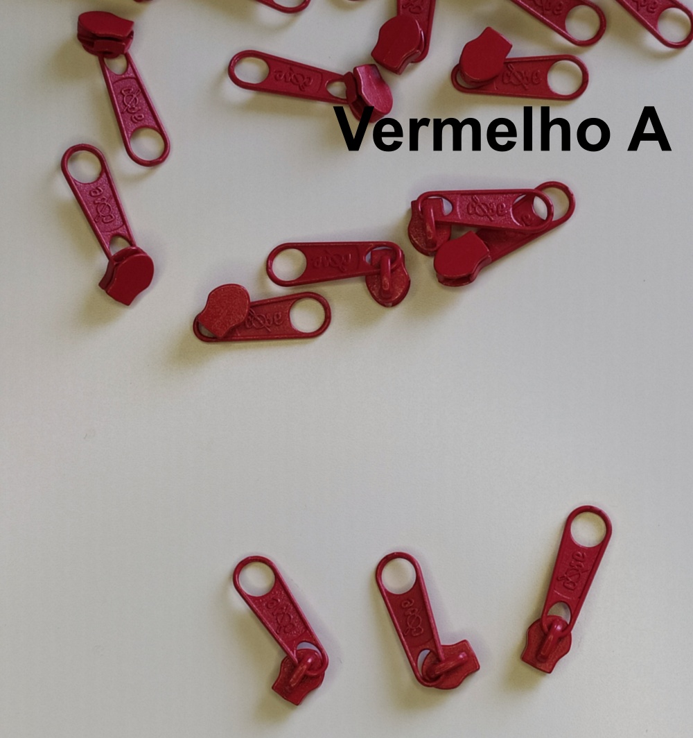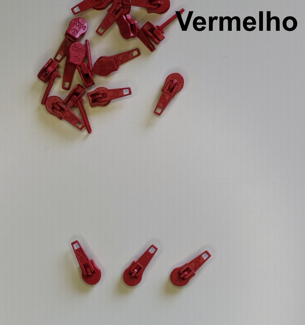 Puxadores de zíper vermelhos dispostos sobre fundo branco com texto 'Vermelho'.