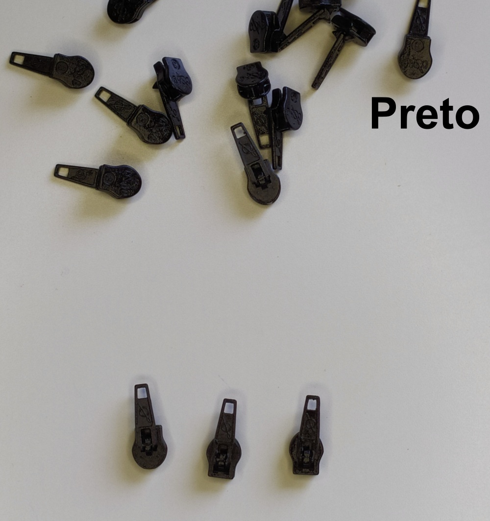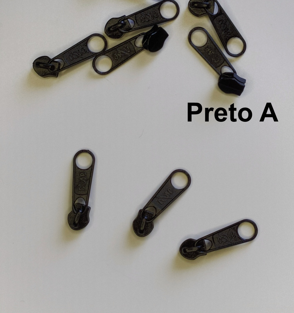 Cursoras de zíper pretos sobre fundo branco com texto 'Preto'