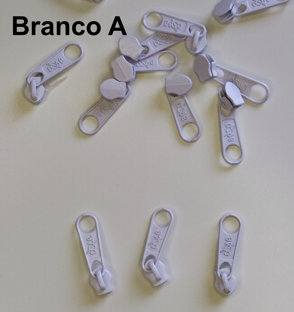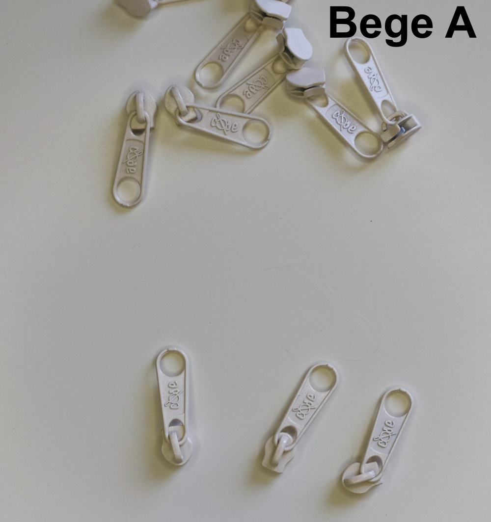 Cursoras de fecho éclair metálicas bege claro sobre fundo branco com texto 'Bege A'