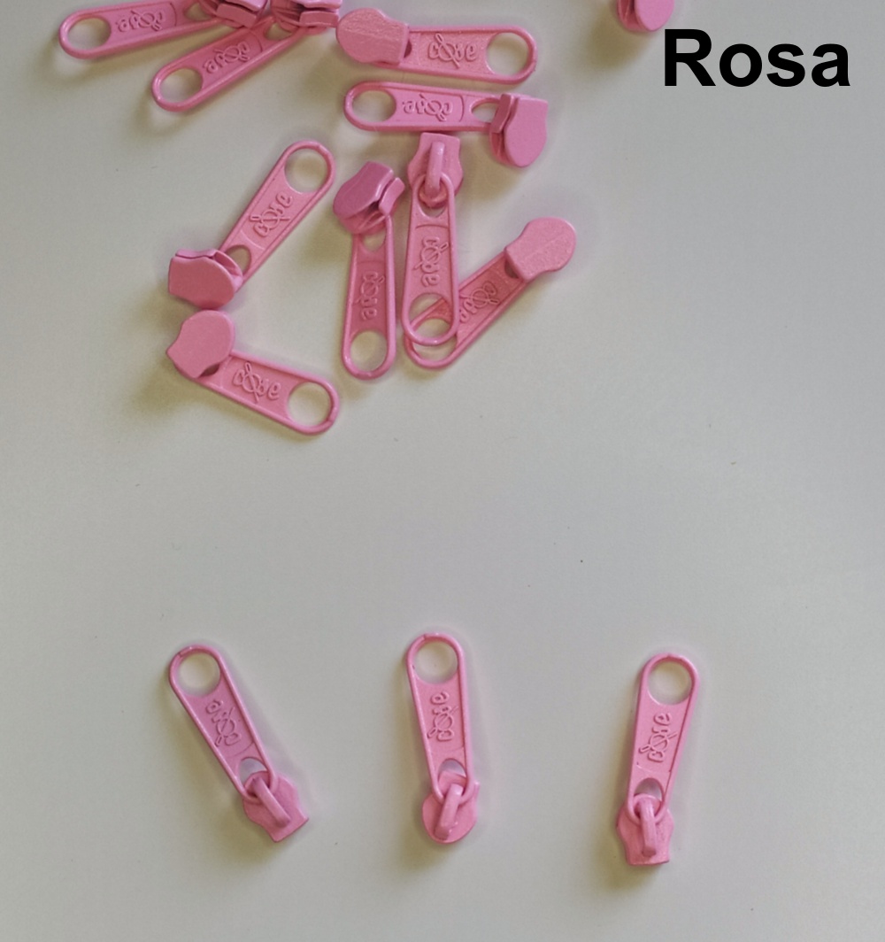 Carrinhos de fecho éclair rosa sobre fundo branco com texto 'Rosa'