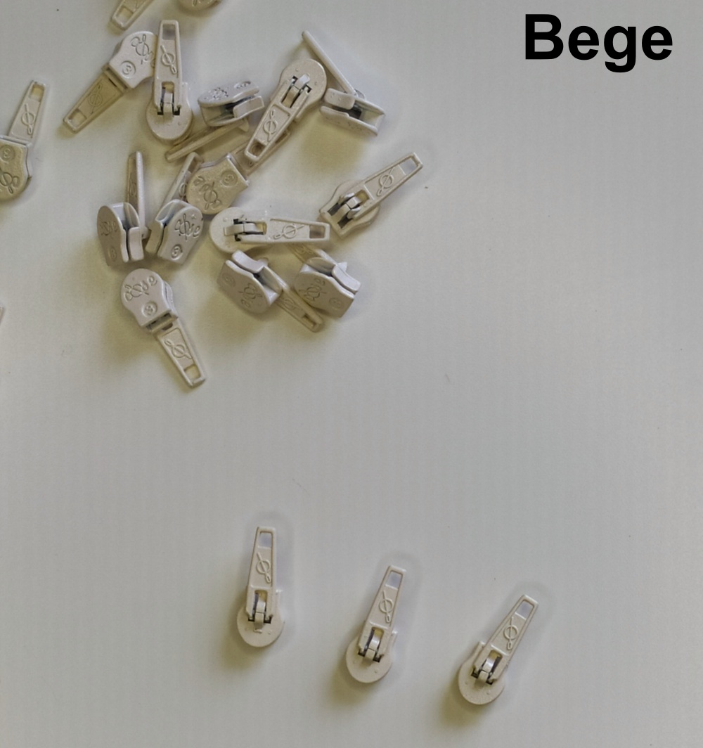 Puxadores de fecho éclair bege em plástico sobre superfície branca com texto 'Bege'