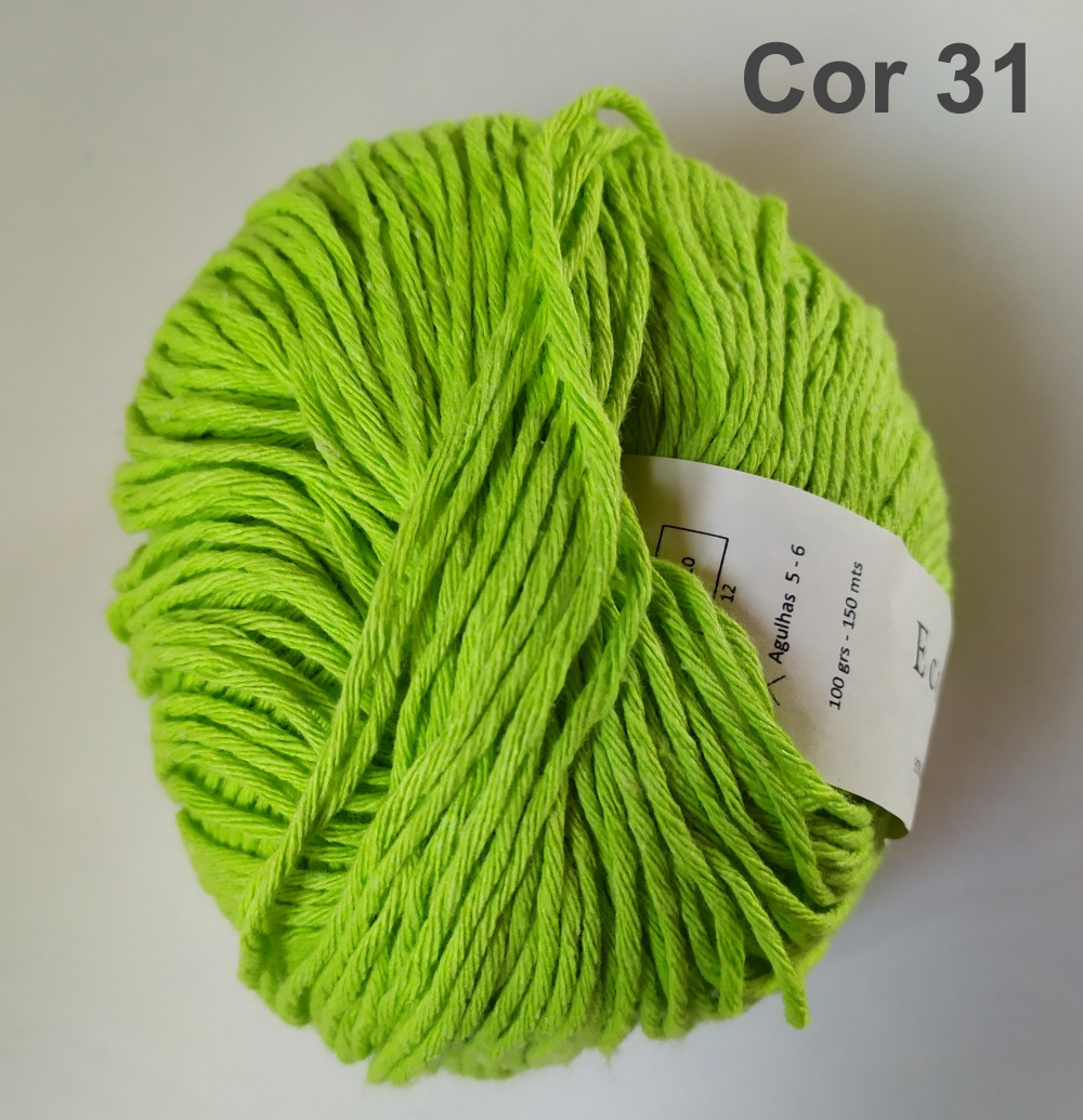 Novelo de lã verde limão com etiqueta e texto Cor 31