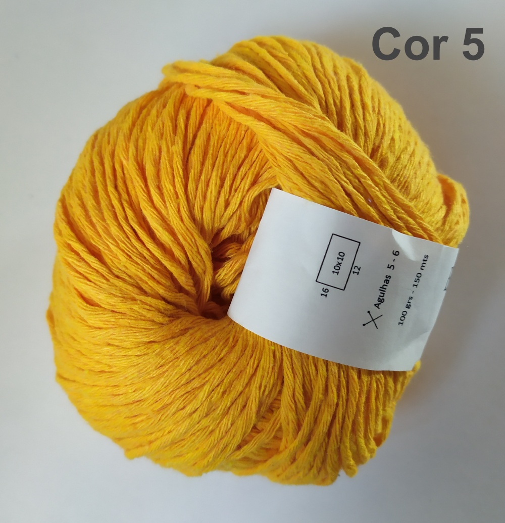 Novelo de lã amarelo com etiqueta branca, texto Cor 5 no fundo branco