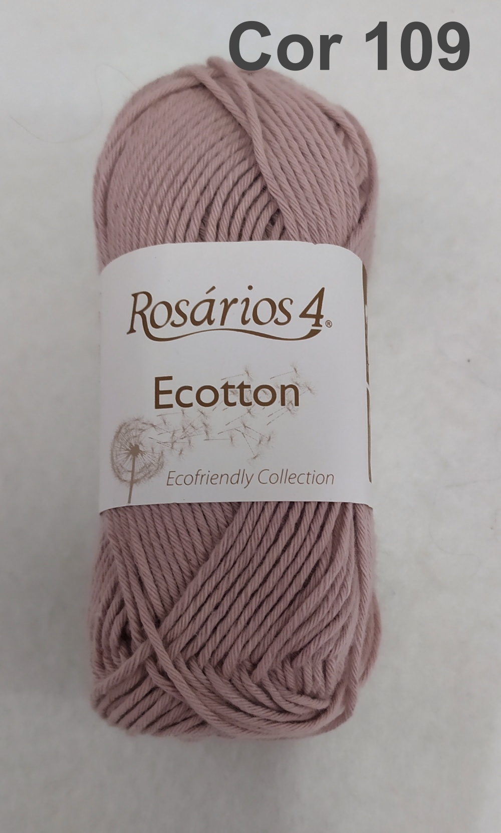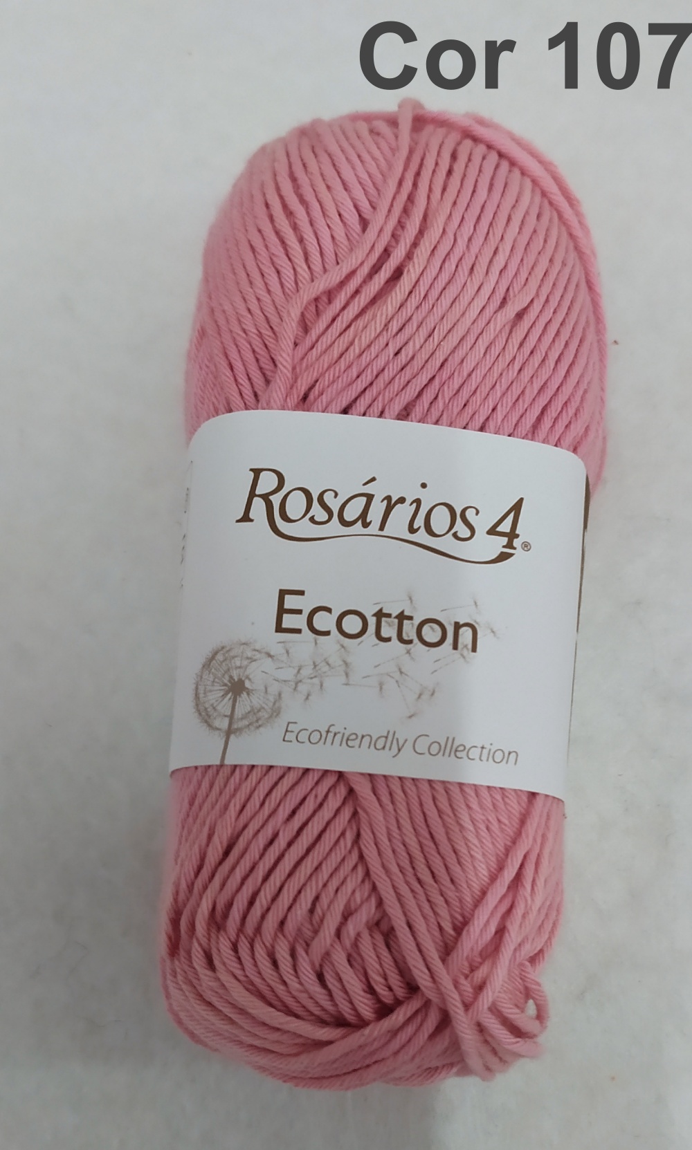Novelo de lã ou algodão rosa com etiqueta Rosários 4 Ecotton e Cor 107