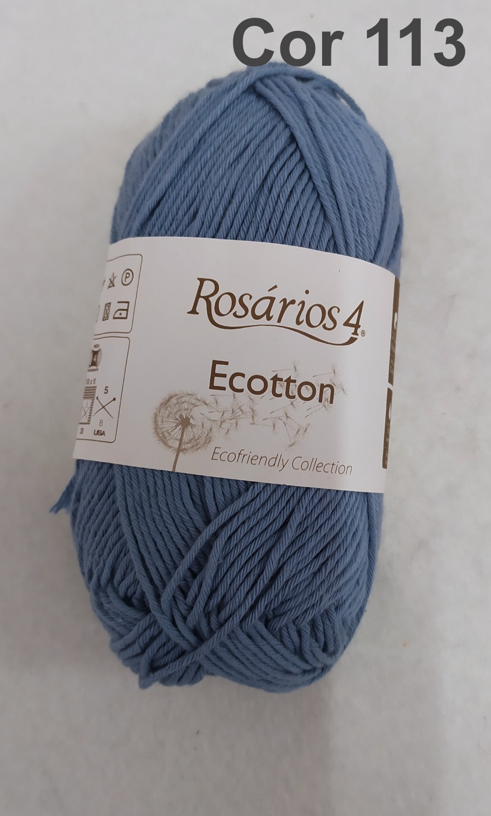 Novelo de fio azul claro Rosários 4 Ecotton cor 111 com rótulo branco e fundo claro