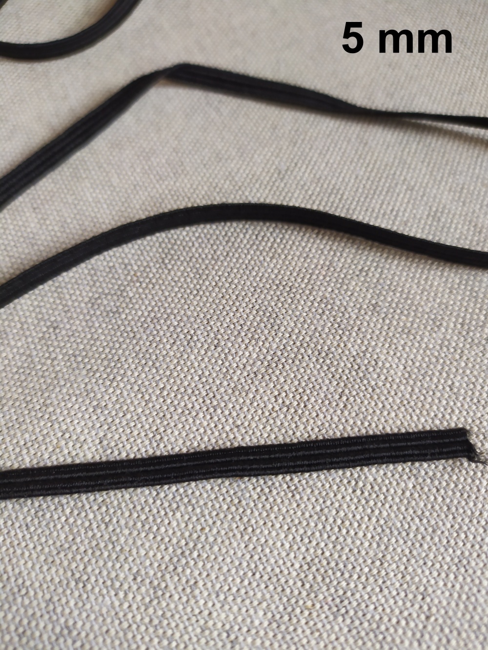 Fitas pretas finas sobre tecido bege com texto 5 mm