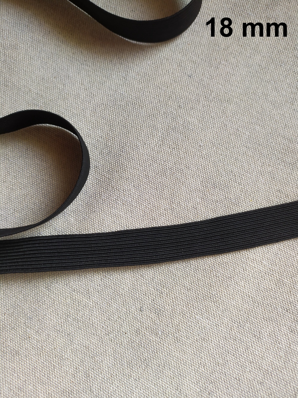 Elástico preto de 18 mm sobre tecido bege claro com texto 18 mm