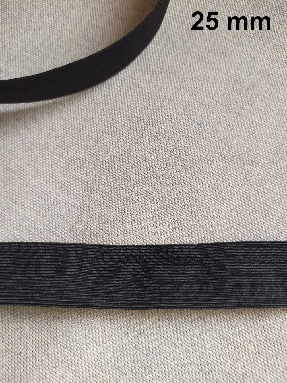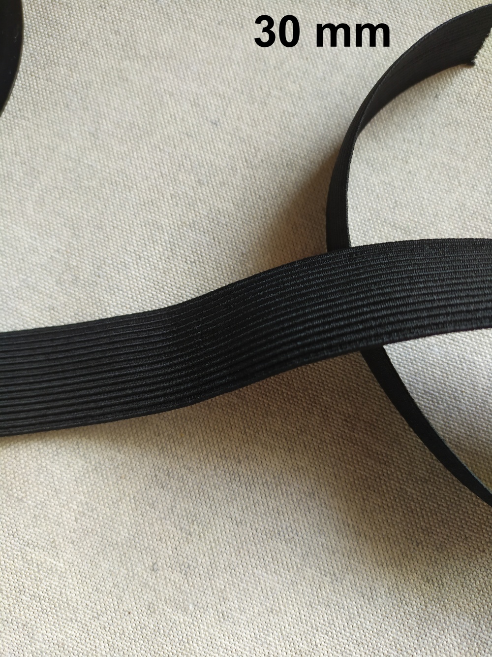 Fita elástica preta canelada com texto '30 mm' sobre tecido bege