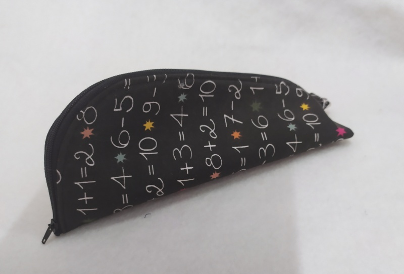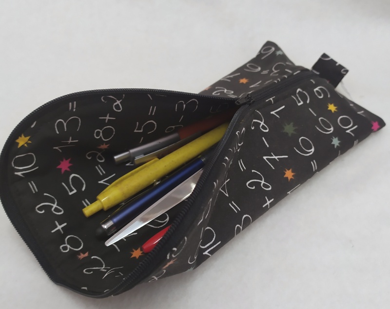 Estojo escolar preto com estampado de operações matemáticas e estrelas coloridas
