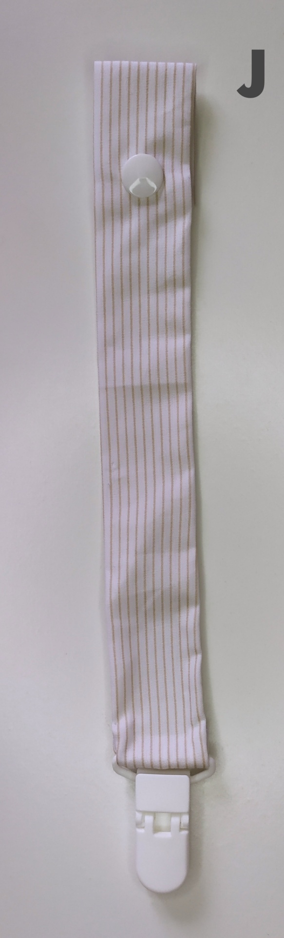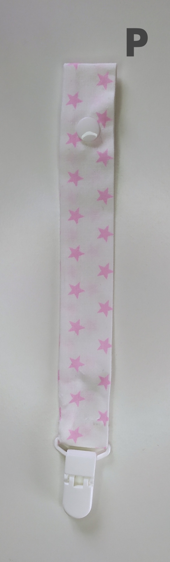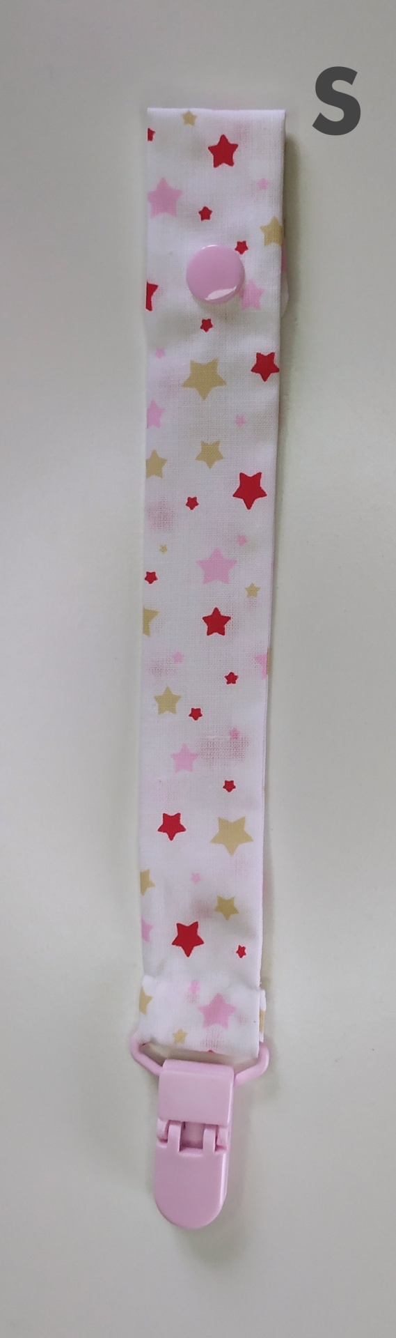 Clipe para chupeta com fita de tecido branca com estrelas coloridas e fecho rosa