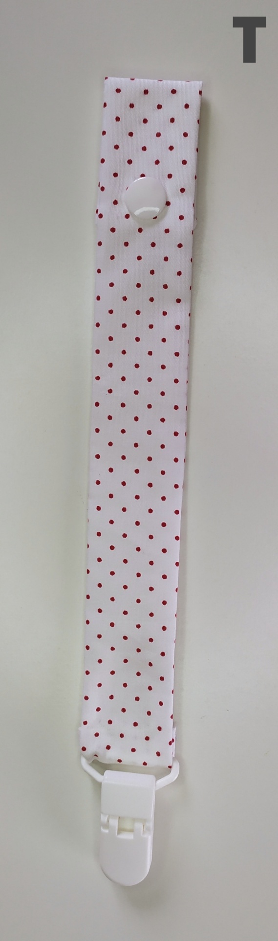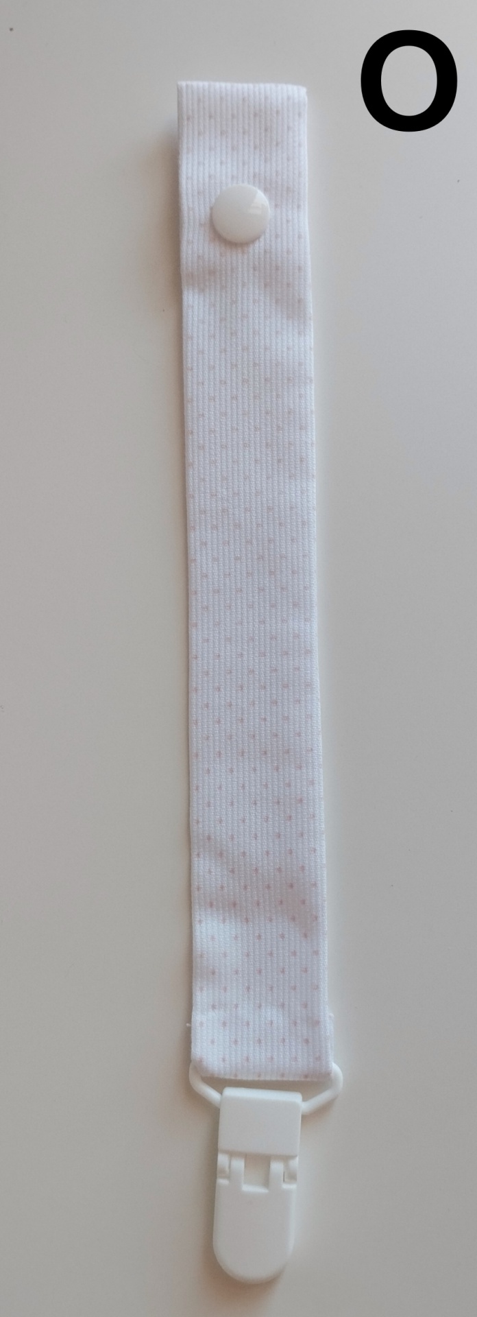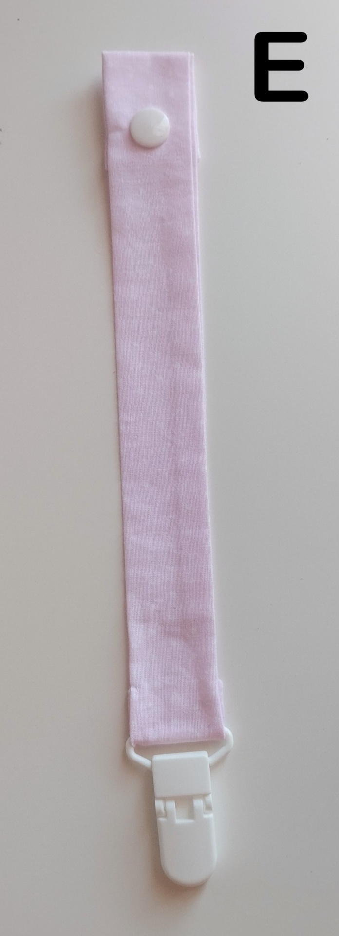 Tira rosa clara com botão branco e clip plástico em fundo branco com letra E preta