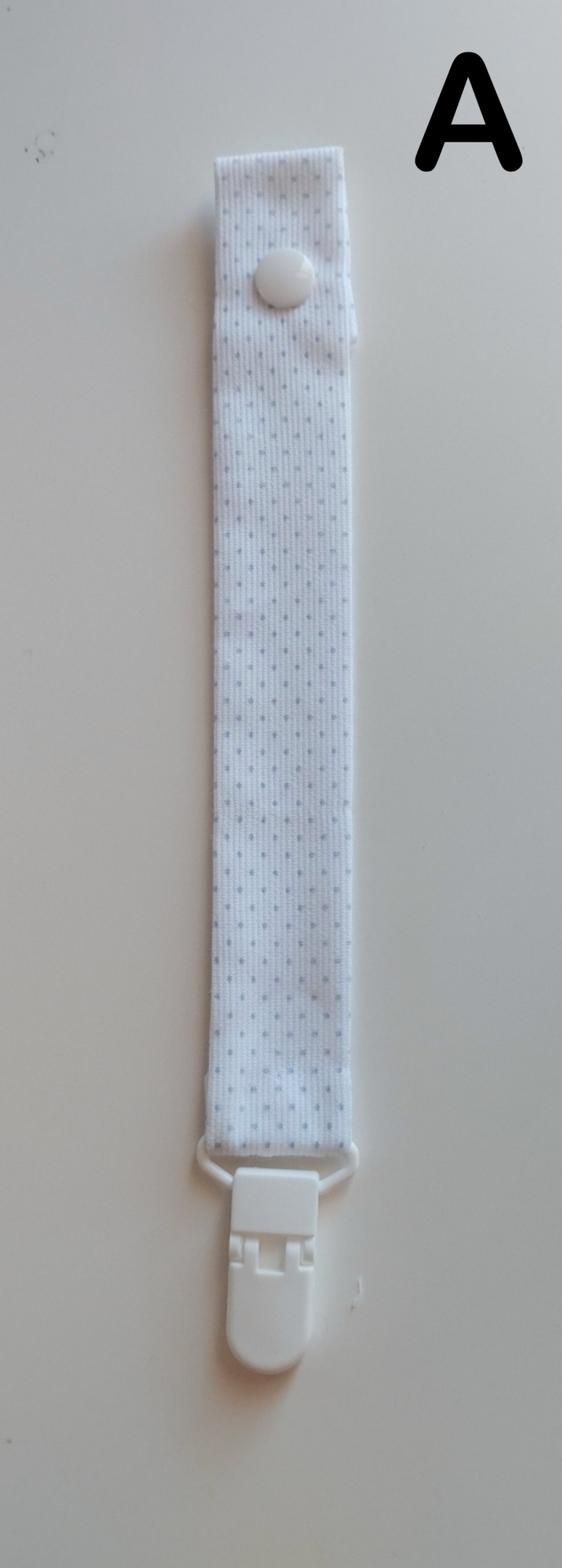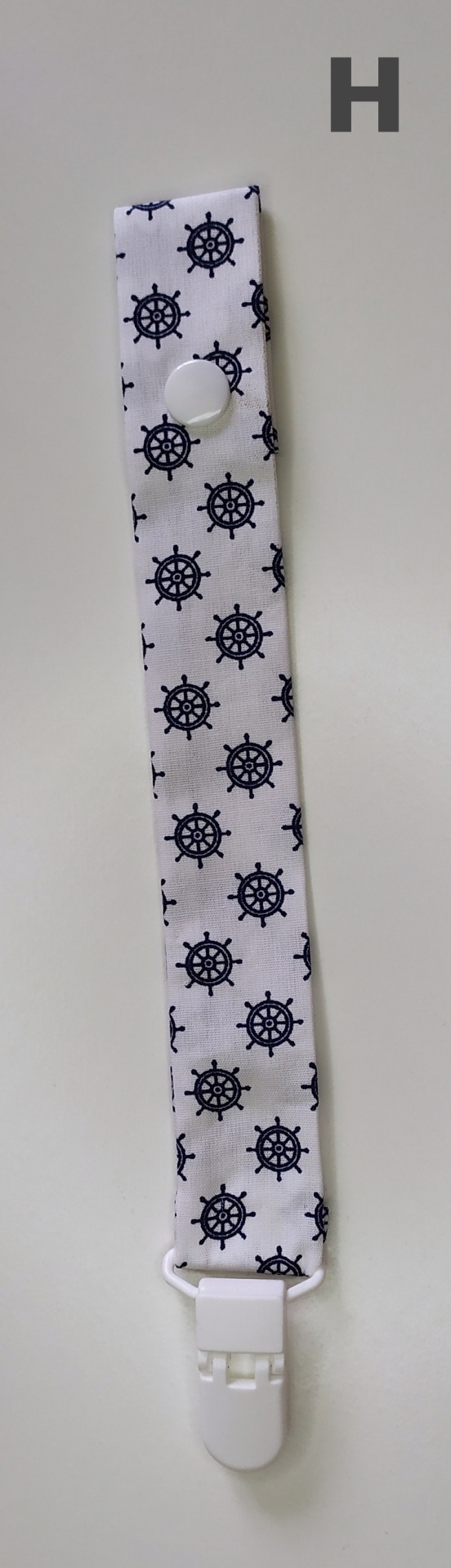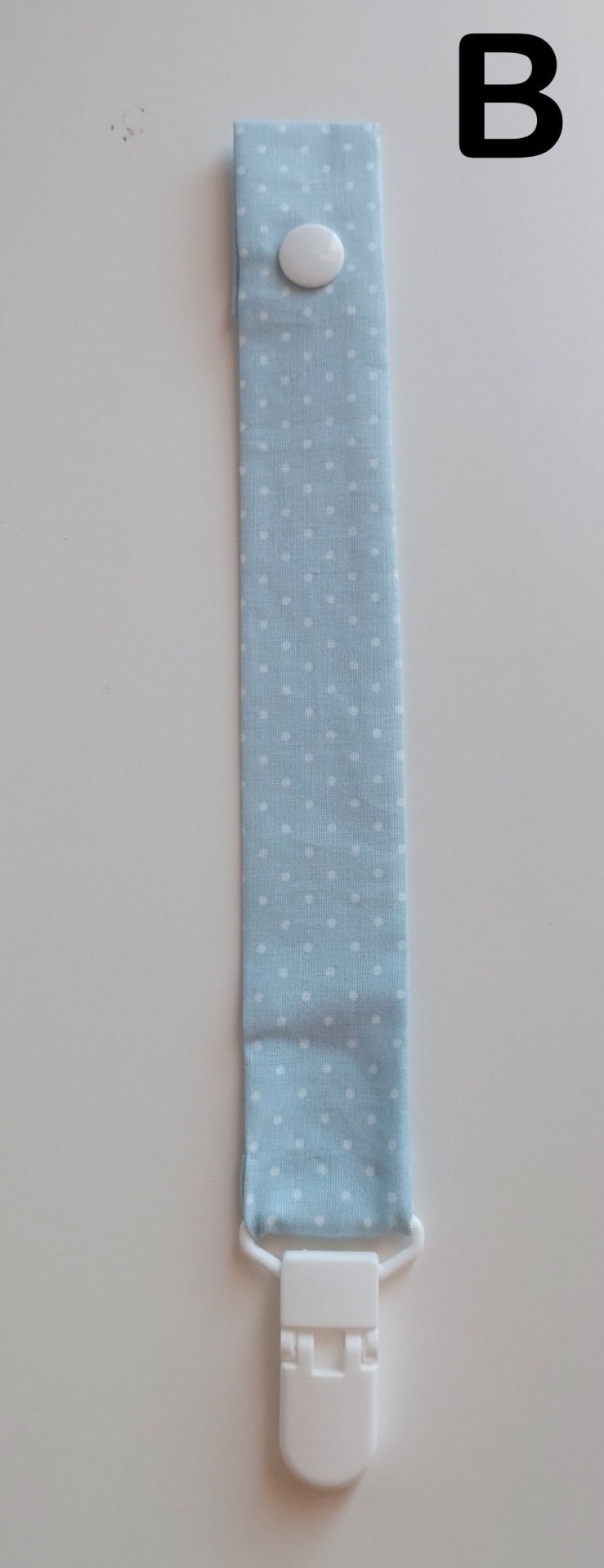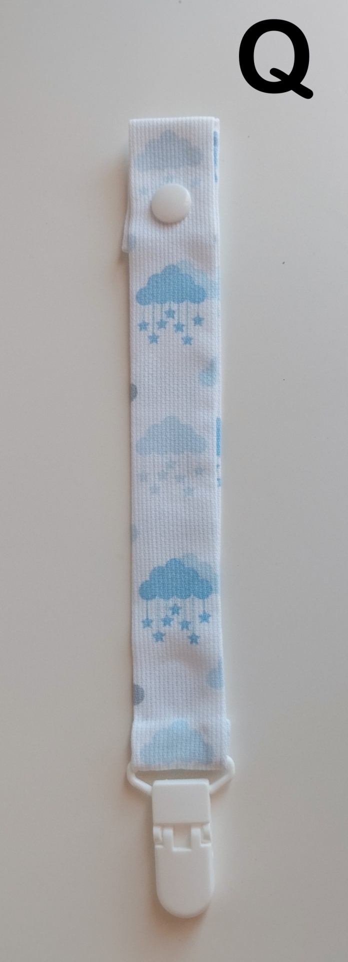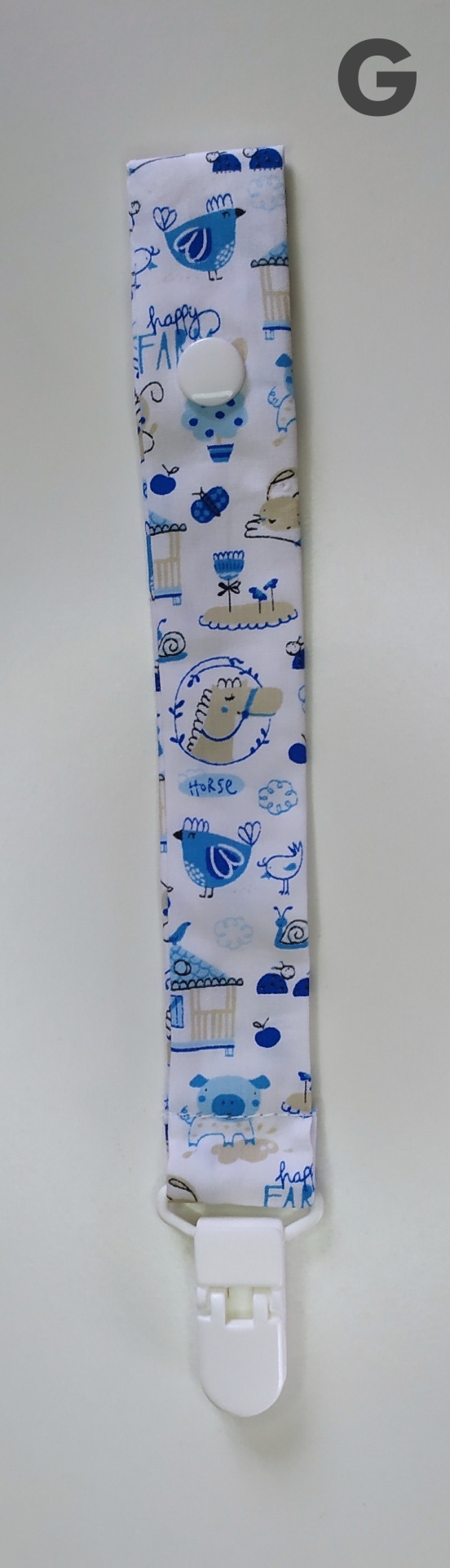 Clipe para chupeta estampado azul e branco com fecho plástico branco