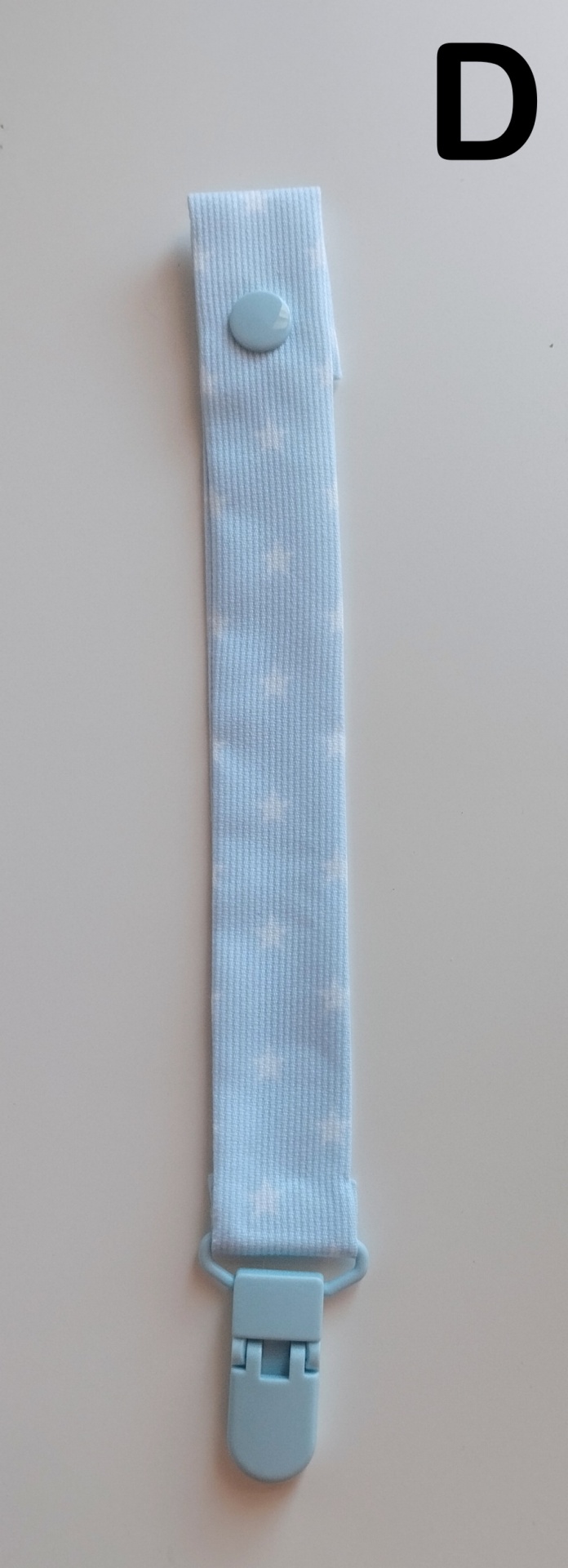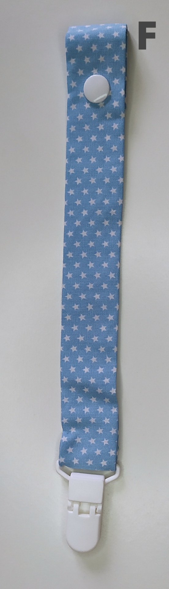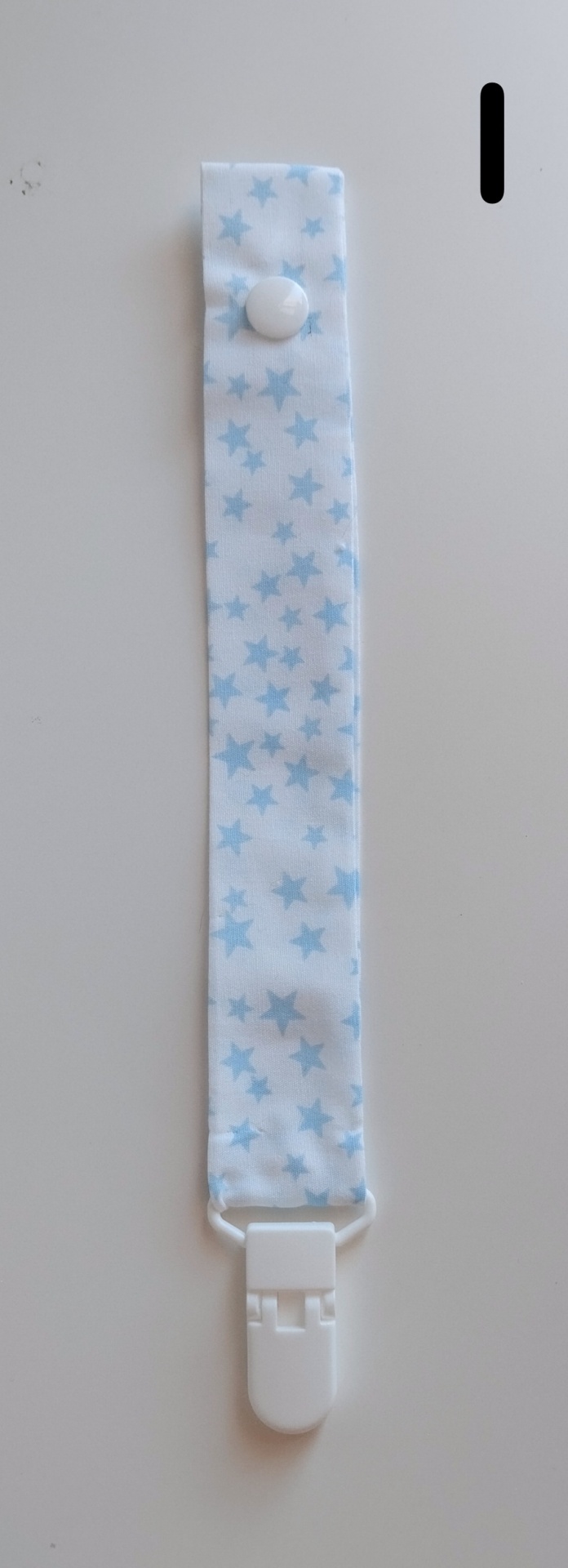 Suporte para chupeta azul claro com padrão de estrelas e clip azul