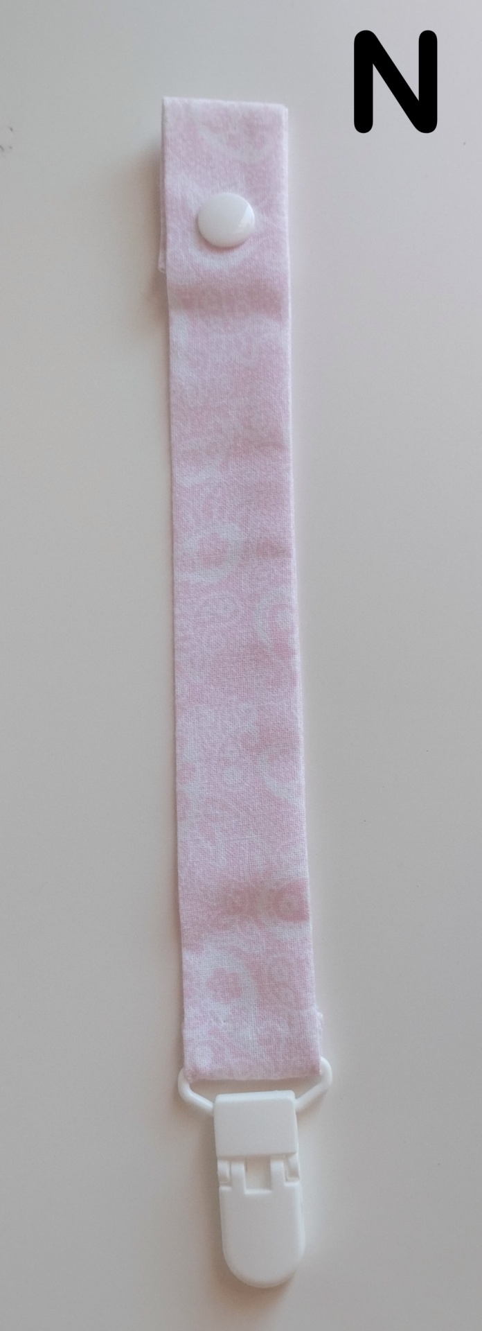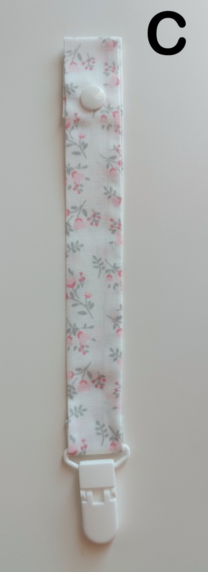 Presilha para chupeta rosa claro com padrão floral e clipe branco