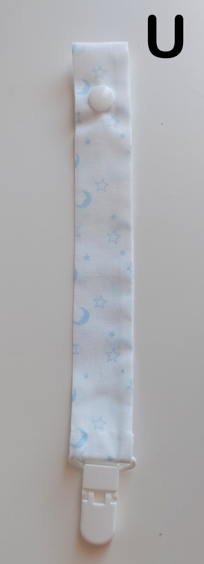 Clip para chupeta branco com padrão de luas e estrelas azuis