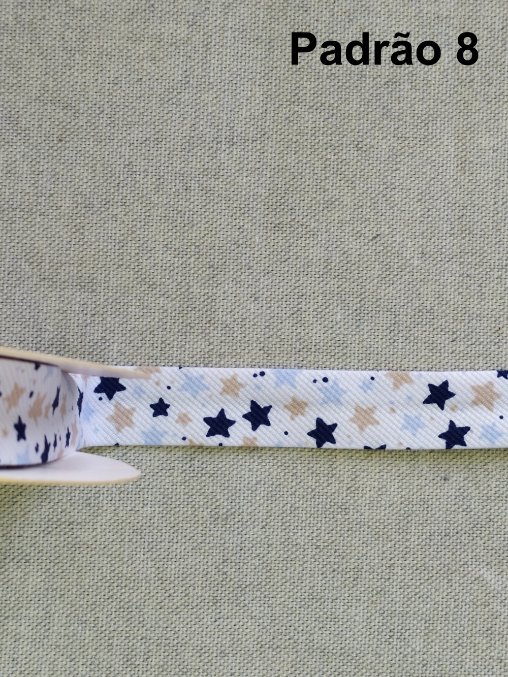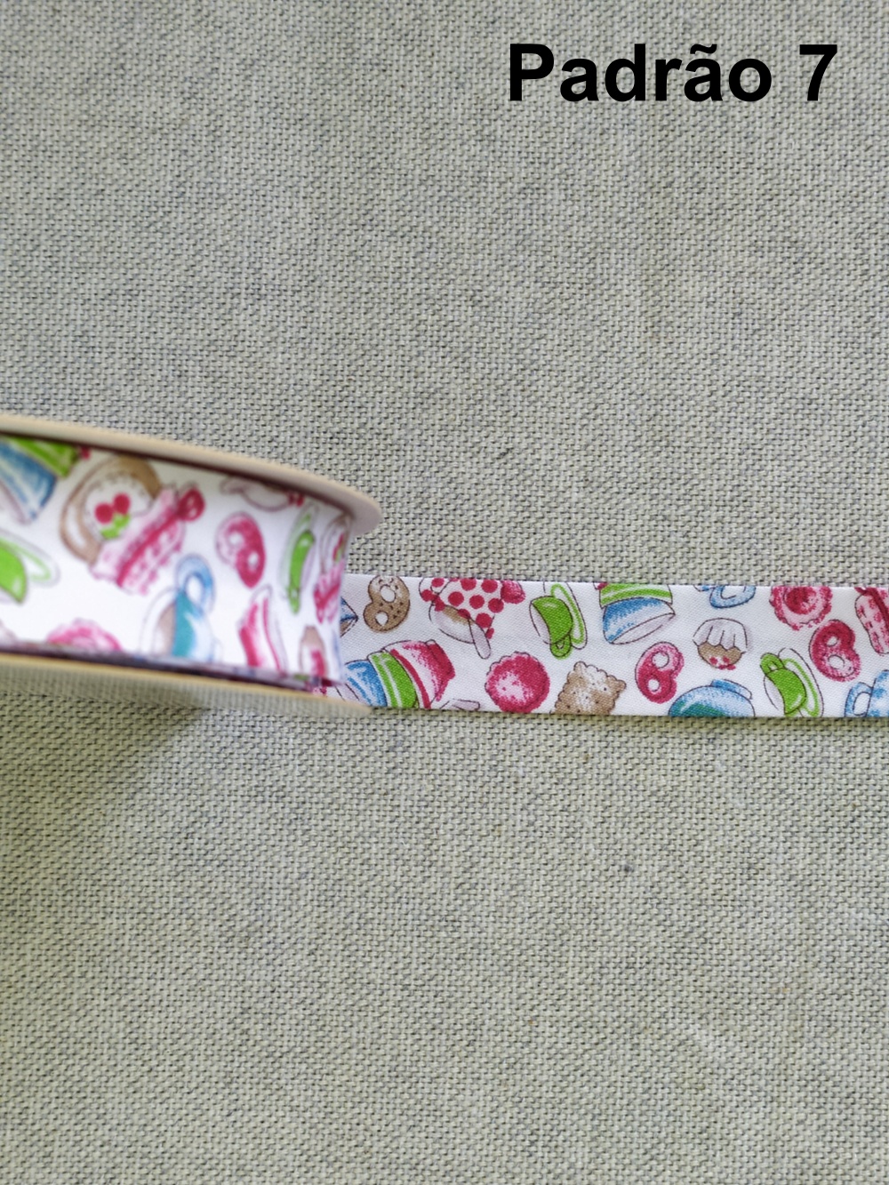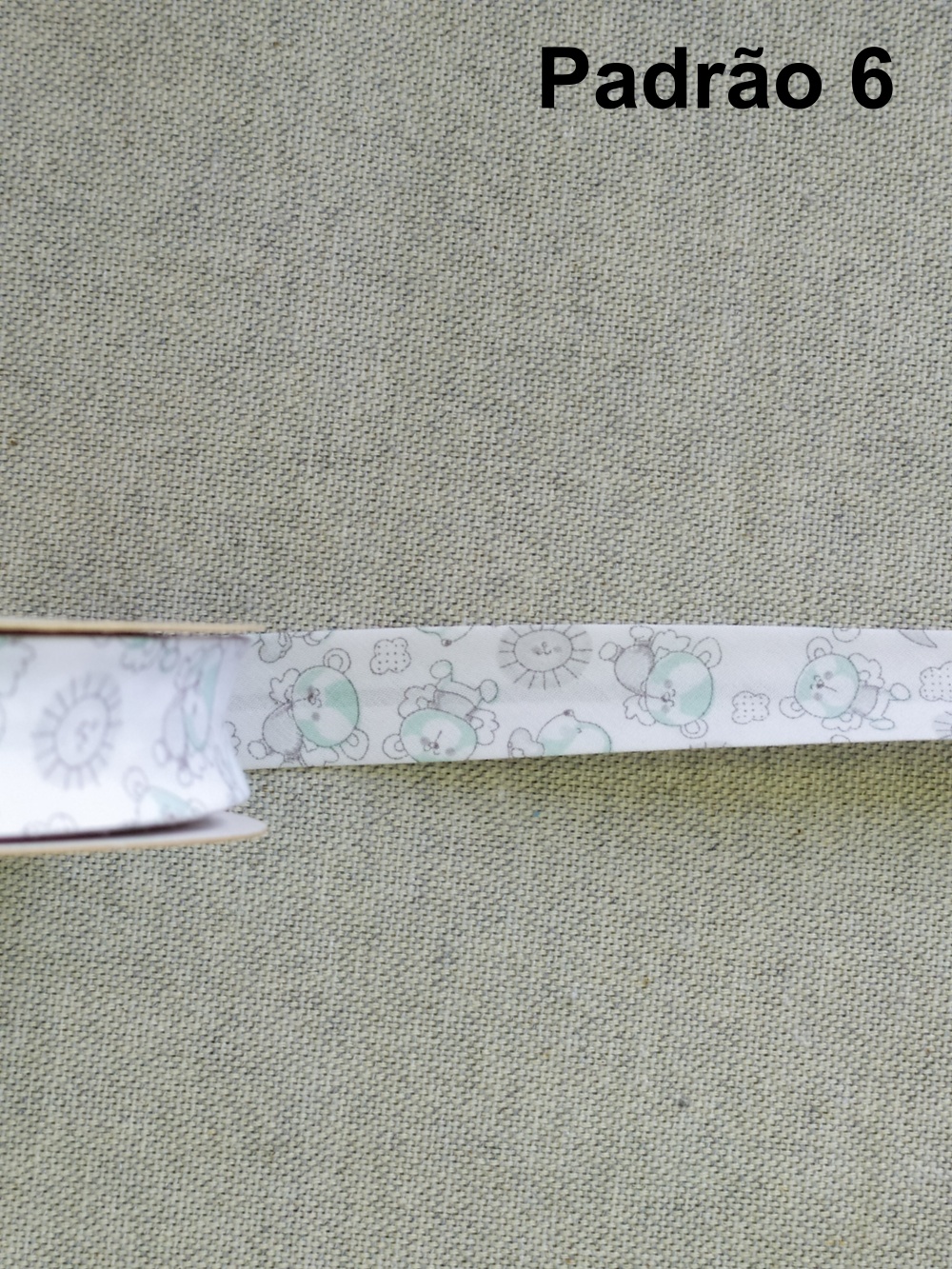 Fita branca texturizada em rolo sobre tecido bege, texto 'Padrão 4' ao fundo