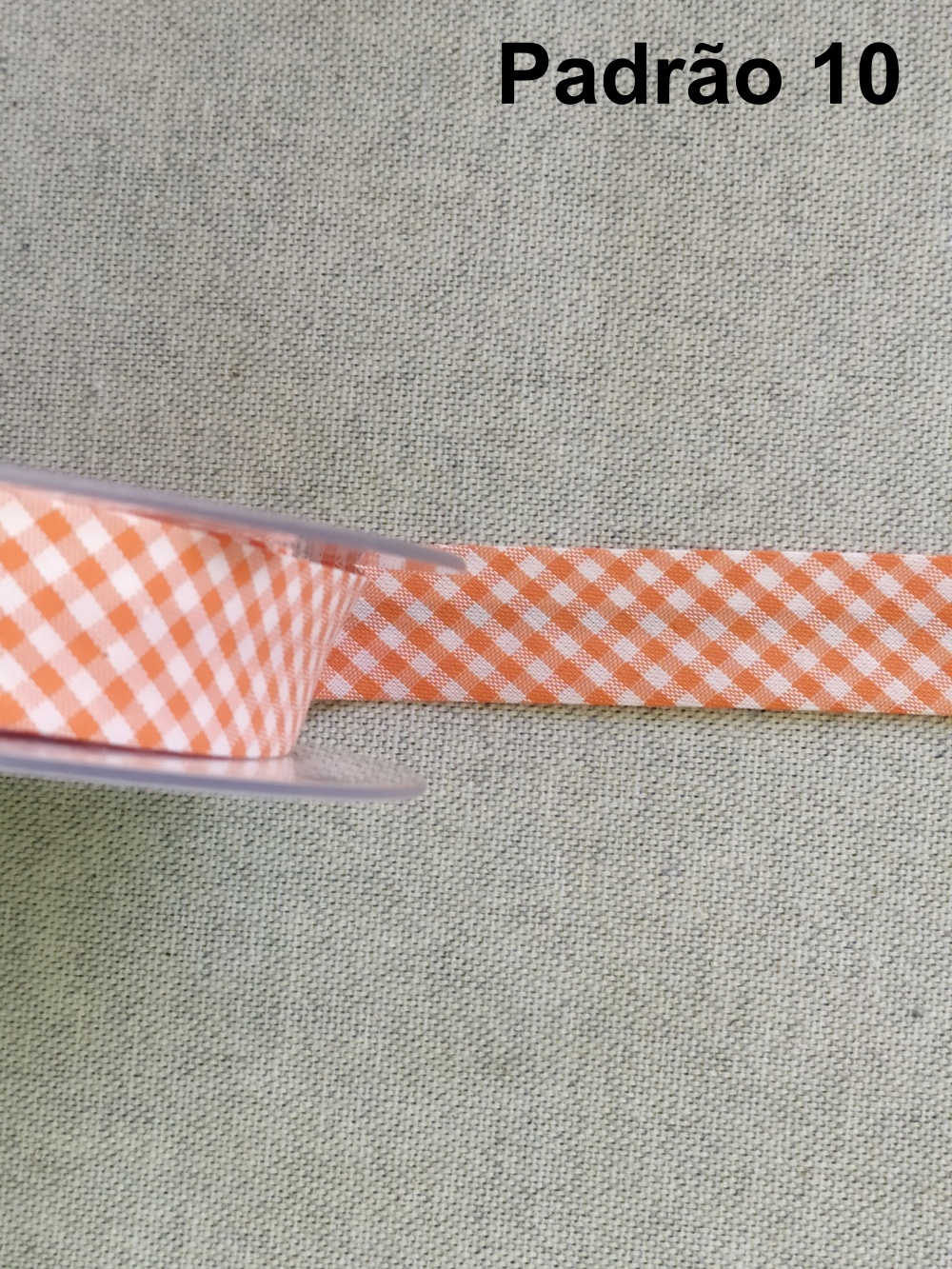 Fita decorativa xadrez laranja e branca em rolo sobre tecido cinza claro