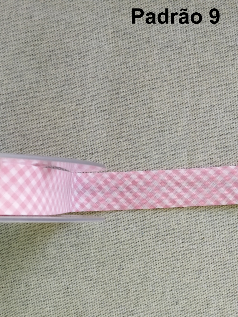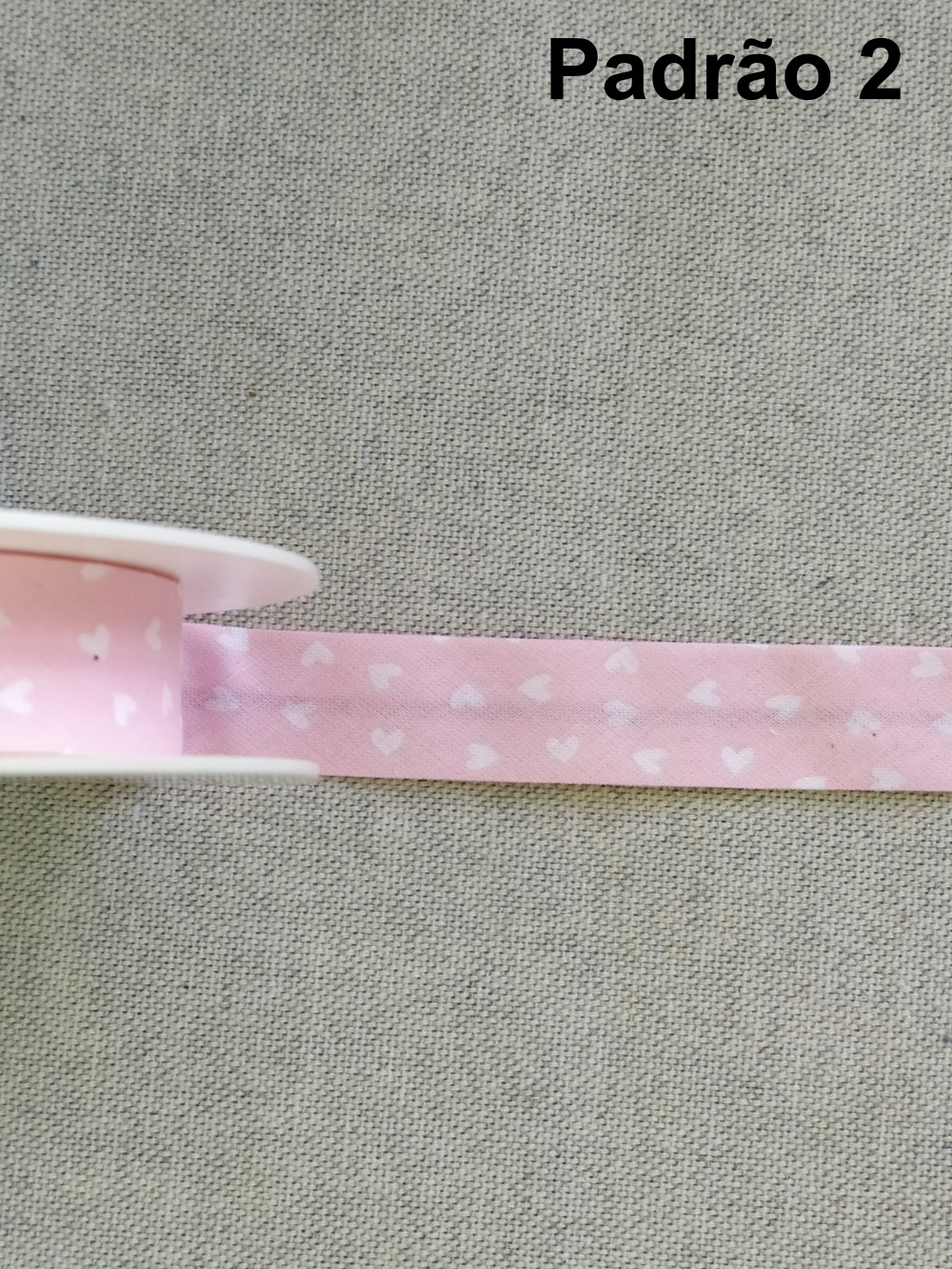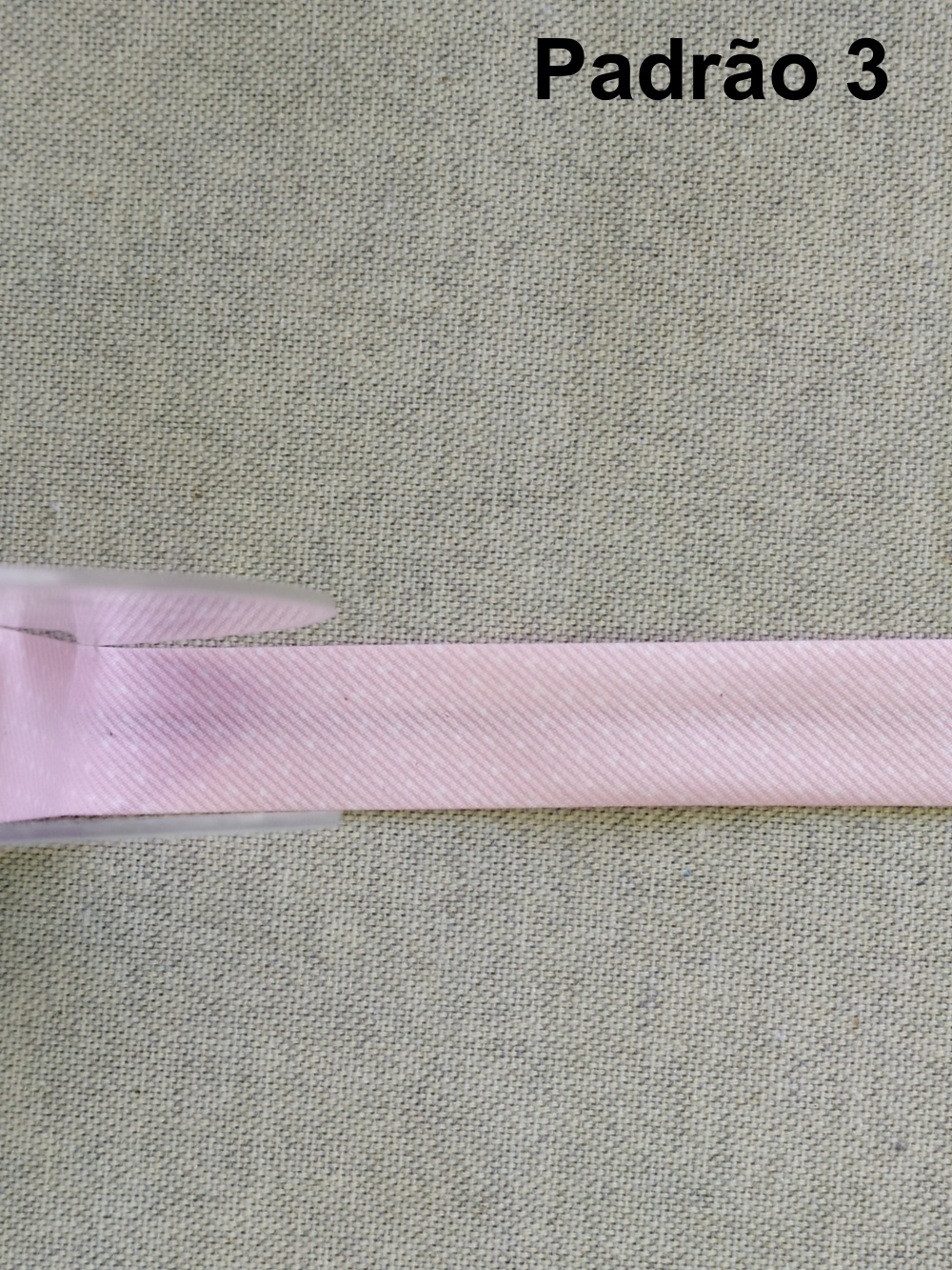 Fita rosa clara em tecido sobre superfície cinzenta com texto Padrão 3
